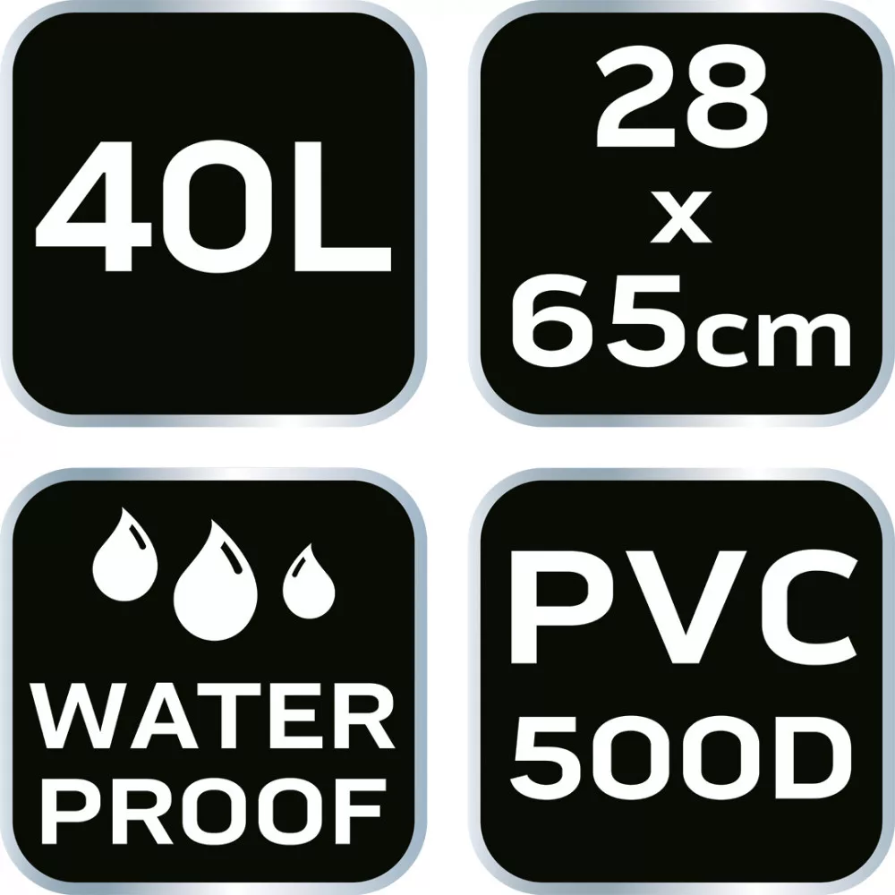 A NEO TOOLS 63-162 40L-es PVC vízálló hátizsák 2 az 1-ben termék, amely a két levehető, állítható pántnak köszönhetően praktikus táskaként és hátizsákként is használható. A táska jellemzője, hogy a főzseb szorosan záródik a tekercseléssel és a csattal történő rögzítéssel. Ezenkívül egy vízálló cipzárral ellátott zsebbel rendelkezik. Kapacitása 40 liter. Tartós 500D PVC anyagból készült. Méretei 28 x 65 cm.