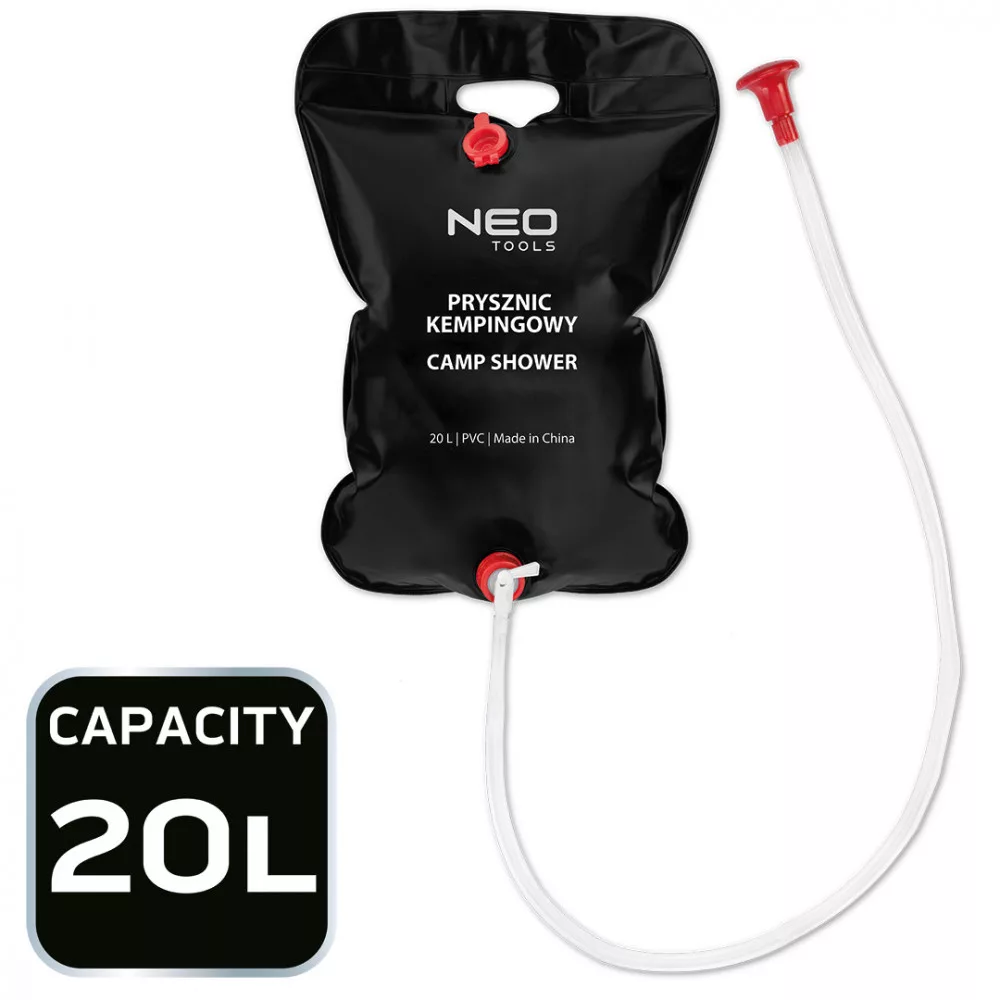 A NEO TOOLS 63-164 kempingzuhany egy egyszerű, praktikusan használható eszköz. PVC-ből készült, és 20 literes űrtartalommal rendelkezik. Súlya mindössze 400 gramm, így könnyen hordozható és szállítható. 65 cm hosszú tömlővel, megerősített fogantyúval és kézi kapcsolóval rendelkezik. A vizet napenergiával melegíti. A kempingzuhany tökéletesen alkalmas utazáshoz vagy kempingezéshez. Méretei 60 x 40 cm.