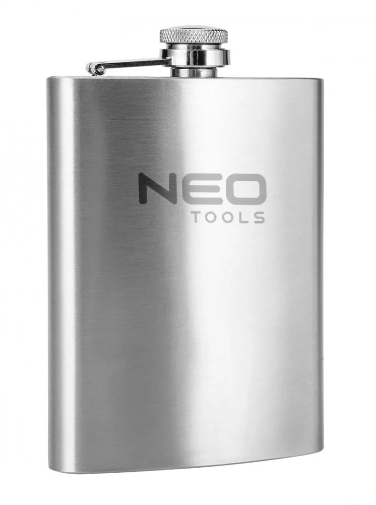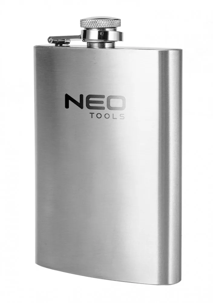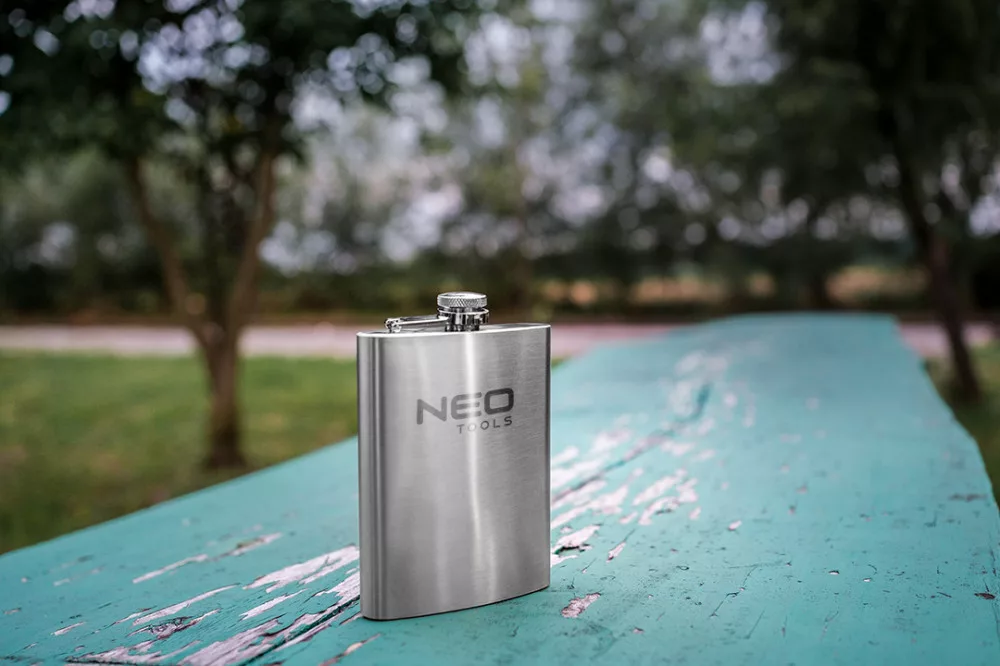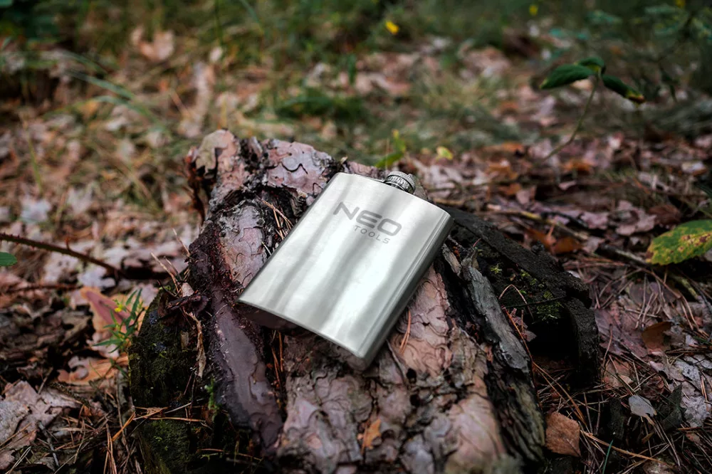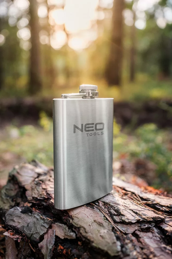 A NEO TOOLS 220 ml-es rozsdamentes acél flaska 220 ml űrtartalmú, 140 x 94 x 26 mm-es méretekkel rendelkező rozsdamentes acél flaska. Szoros, zsanérral ellátott kupakkal rendelkezik, amely megakadályozza a szivárgást is. A flaska ellenáll a sérüléseknek. Az LFGB tanúsítvány megerősíti az élelmiszerrel való érintkezés engedélyezésének való megfelelést. Praktikus ajándék utazóknak, kempingezőknek.