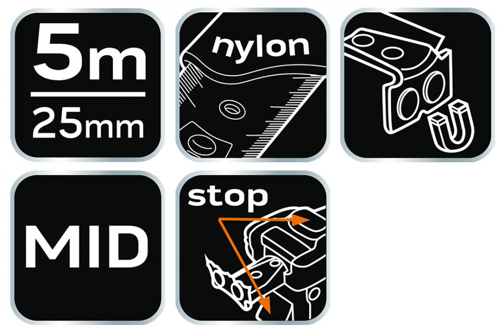 A NEO visszahúzható mérőszalag háza két anyagból - tartós műanyagból és csúszásmentes gumiból - készült, így befolyásolja a kényelmes fogást és a sérülésekkel szembeni ellenállást. A nejlon borítás megvédi a beosztást a kopástól, meghosszabbítva a mérőszalag tartósságát és hosszú ideig biztosítva annak leolvashatóságát.
