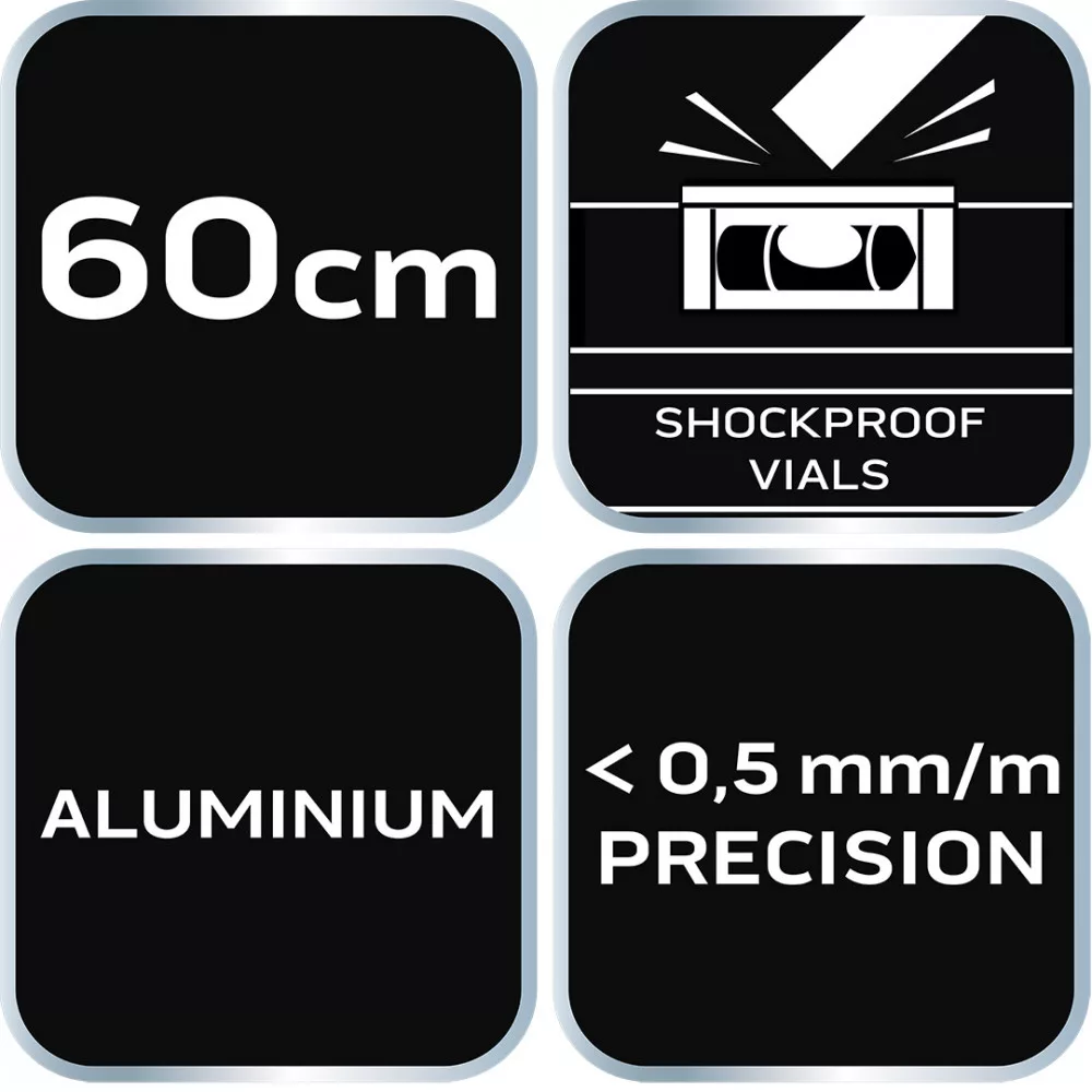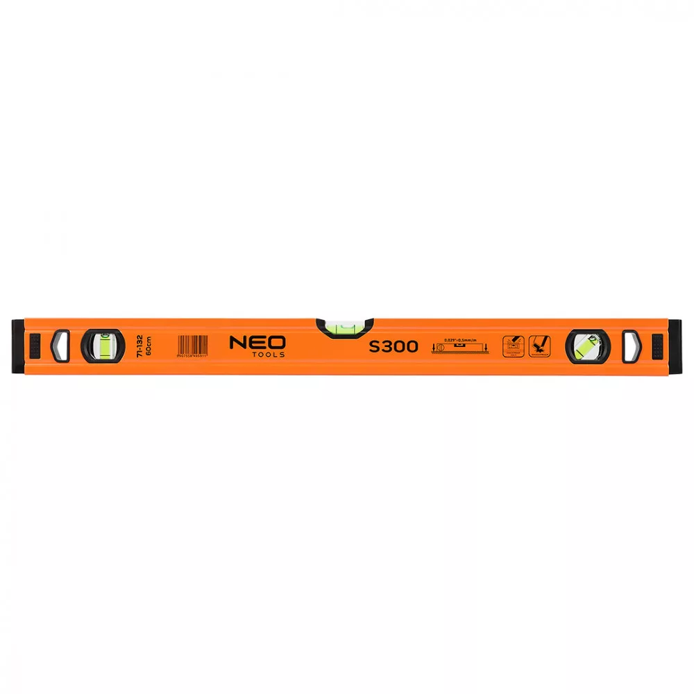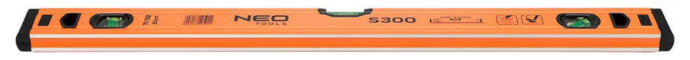 Az S 300 alumínium vízmérték, a NEO-tól egy csúcskategóriás szintező 3 libellával (45, 90 és 180 fok). A kínált modell 51,5x20,5x600 mm-es méretekkel rendelkezik. Profilvastagsága 1 mm, sűrűsége pedig 0,395 kg/m. A libellák pontossága 0,029°=0,5 mm/m. A szerszám alumíniumból készült. A szerkezet 2 ütésgátló végdugóval van ellátva. Szakembereknek és barkácsolóknak ajánlott.