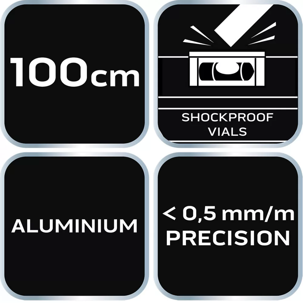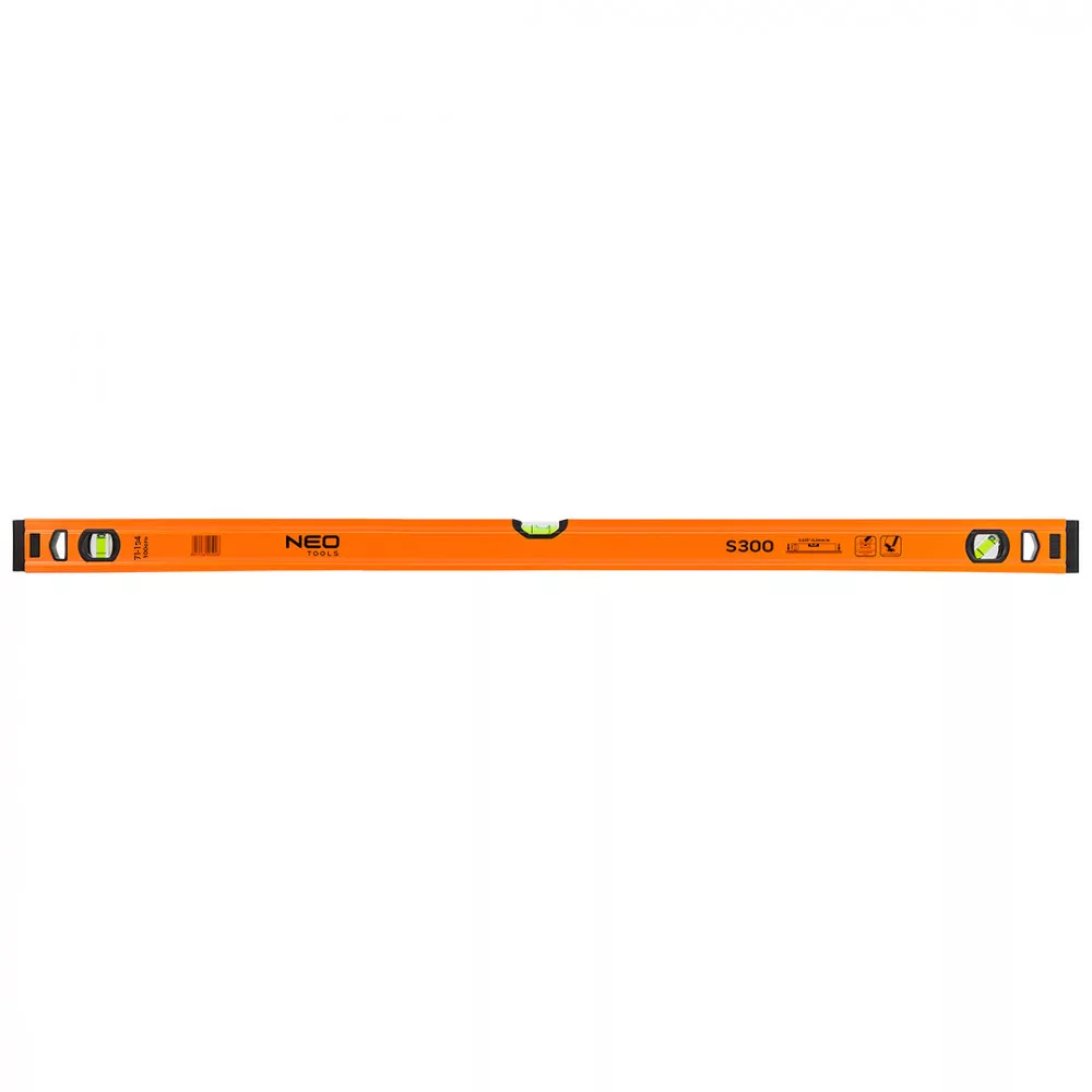 Az S 300 alumínium vízmérték, 3 fiola, 100 cm 71-134 a NEO-tól egy csúcskategóriás mérőműszer beépített három csőszerű fiolával (45, 90 és 180 fok), amely a Föld gravitációs erejét használja az építési síkok vízszintességének vagy függőlegességének meghatározására. A kínált modell 51,5x20,5x1000 mm-es méretekkel rendelkezik. Profilvastagsága 1 mm, sűrűsége pedig 0,395 kg/m. A szint pontossága 0,029°=0,5 mm/m. A szerszám alumíniumból készült. A szerkezet 2 ütésgátló sapkával van ellátva. Szakembereknek és barkácsolóknak ajánlott.