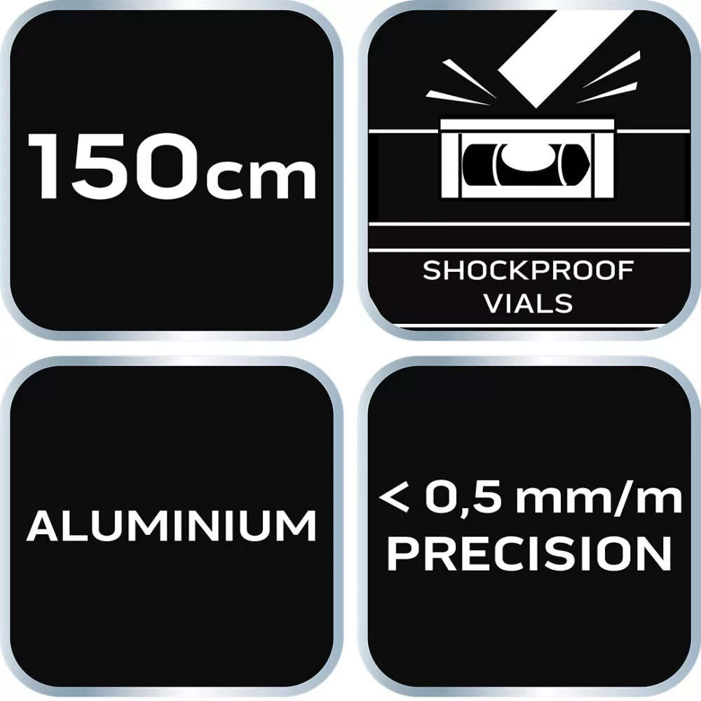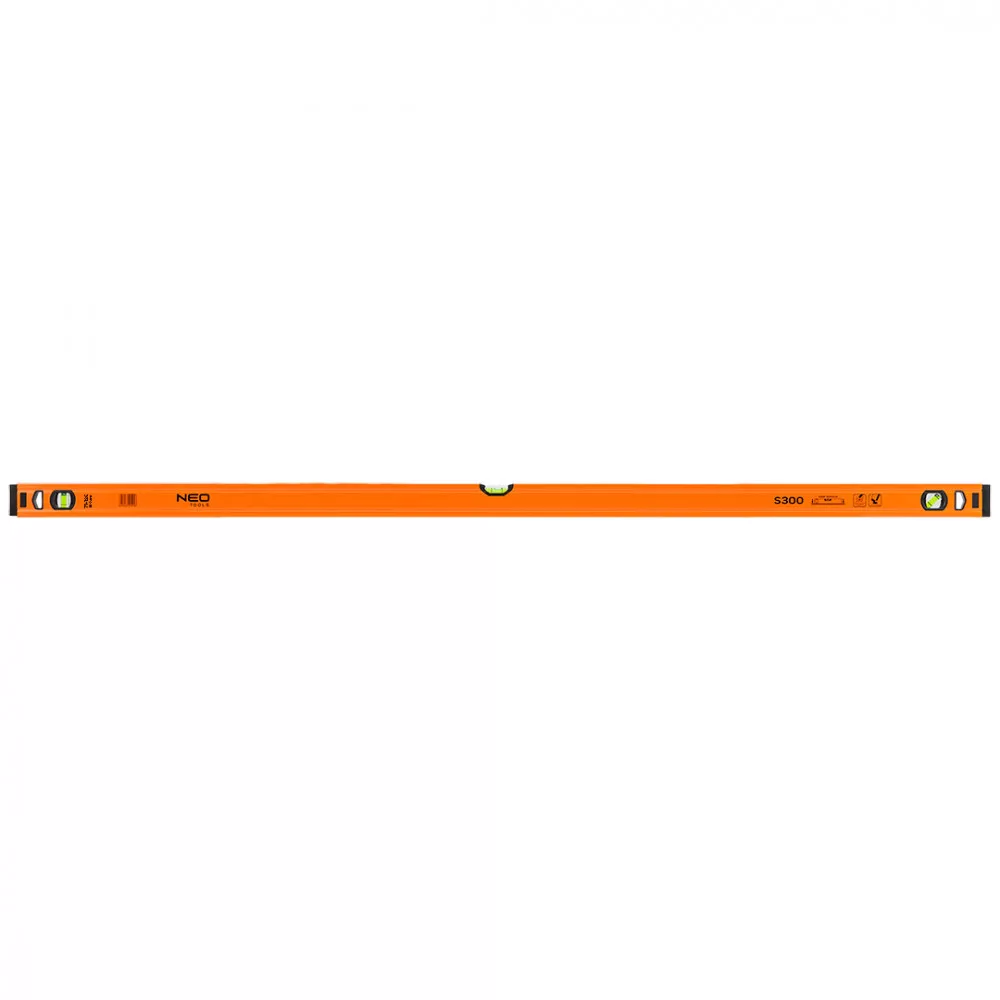 Az S 300 alumínium vízmérték, 3 fiola, 150 cm 71-136 a NEO-tól egy csúcskategóriás mérőműszer beépített három csőszerű fiolával (45, 90 és 180 fok), amely a Föld gravitációs erejét használja az építési síkok vízszintességének vagy függőlegességének meghatározására. A kínált modell méretei 51,5x20,5x1500 mm. Profilvastagsága 1 mm, sűrűsége pedig 0,395 kg/m. A szint pontossága 0,029°=0,5 mm/m. A szerszám alumíniumból készült. A szerkezet 2 ütésgátló sapkával van ellátva. Szakembereknek és barkácsolóknak ajánlott.