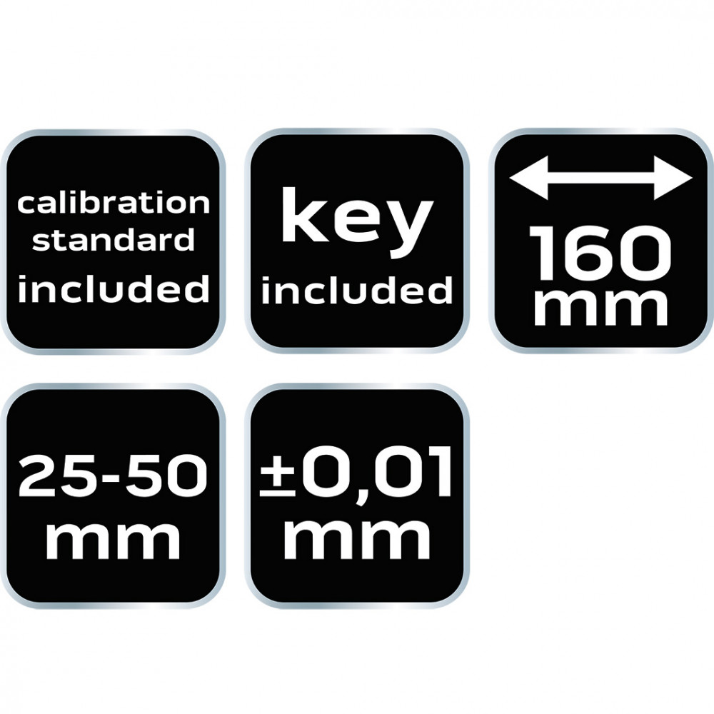 A NEO 75-021-es 25-50 mm-es nóniusz mikrométere ±0,01 mm-es mérési pontosságot kínál. Ez egy speciális mérőeszköz, amely tárgyak geometriai méreteinek mérésére szolgál. Jellemzője a 160 mm hosszúság, a 80 mm szélesség és a 25 mm magasság. Súlya 370 g. A mikrométer kiváló minőségű kivitelezéssel rendelkezik - könnyen leolvasható skála/nyak, sima dobműködés és pontos mérés. Az eszköz használata egyszerű. A készletet egy nullázó kulccsal, egy szabványos és egy praktikus műanyag dobozban kínáljuk. A NEO márkát szakemberek és barkácsolók számára ajánljuk.