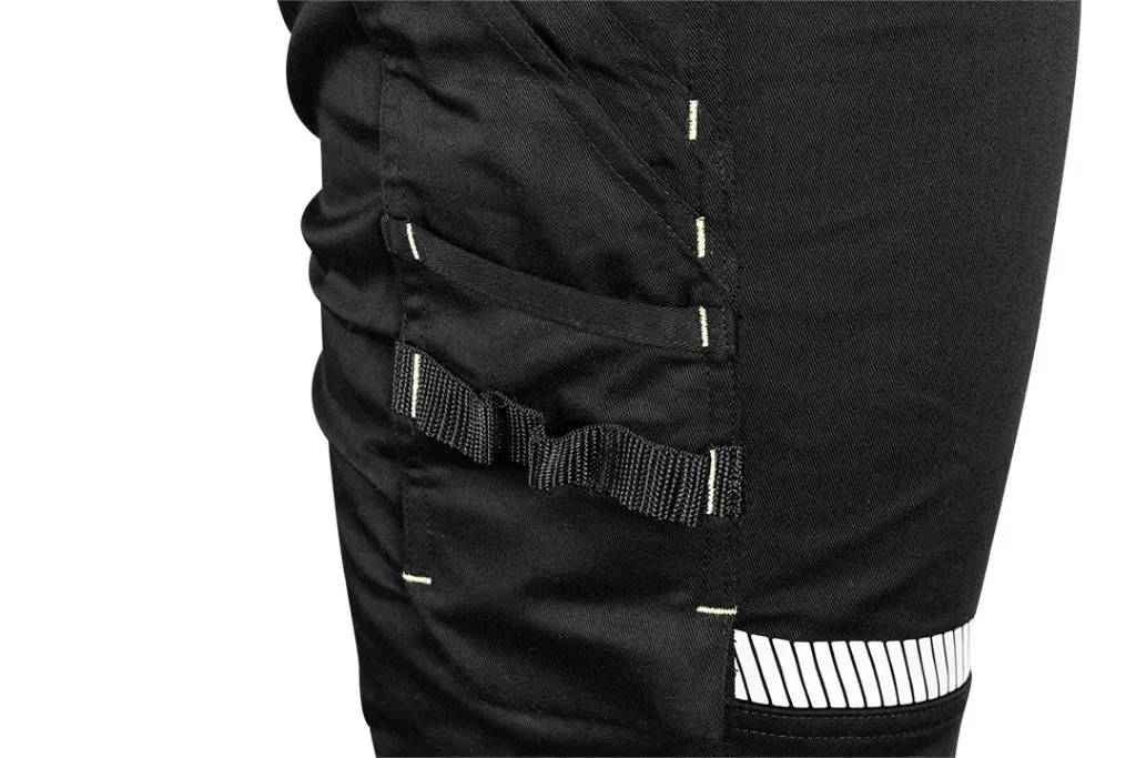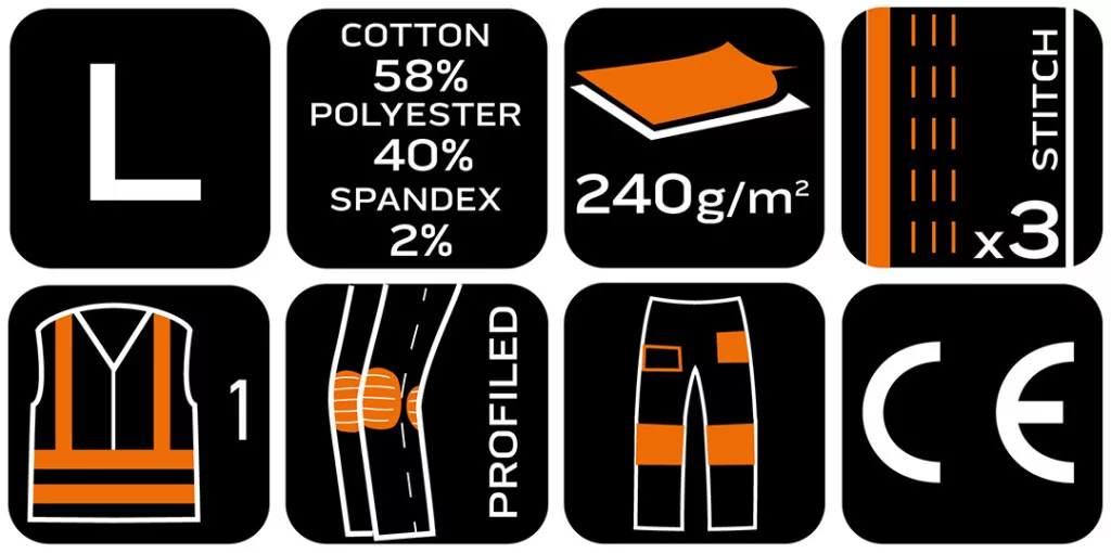 NEO Láthatósági munkásnadrág, Mix&Match, 1. osztályú láthatóság, 240g/m2, 58%pamut, 40%poliészter,2%elasztán, külső zsebekkel, profilozott térdbetétekkel, fekete-sárga. A sárga fluoreszkáló elemek és a fényvisszaverő csíkok növelik a felhasználó láthatóságát és biztonságát. A ruhadarab súlya 240 g/m2, anyagösszetétele: 58% pamut, 40% poliészter és 2% elasztán, megfelelő tartósságot és rugalmasságot biztosít. Háromszorosan varrott varrásokkal és profilozott térdekkel ellátva biztosítja a viselési kényelmet és a robusztusságot hosszú hónapokig tartó használat során. A NEO TOOLS nadrág praktikus szerszámhorgokkal, többfunkciós zsebekkel, térdvédő zsebbel és azonosító címkével rendelkezik. A térd fölötti fényvisszaverő nyomtatásnak köszönhetően további láthatóságot biztosít a munkahelyen. A CE tanúsítvánnyal rendelkező nadrág az EN ISO 13688:2013 szabványnak is megfelel.