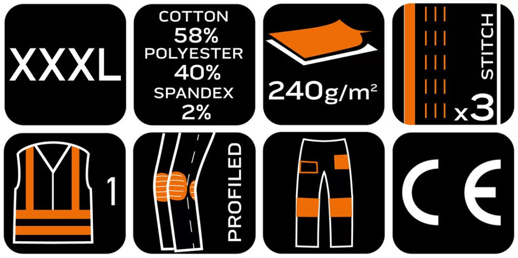 NEO Láthatósági munkásnadrág, Mix&Match, 1. osztályú láthatóság, 240g/m2, 58%pamut, 40%poliészter,2%elasztán, külső zsebekkel, profilozott térdbetétekkel, fekete-sárga. A sárga fluoreszkáló elemek és a fényvisszaverő csíkok növelik a felhasználó láthatóságát és biztonságát. A ruhadarab súlya 240 g/m2, anyagösszetétele: 58% pamut, 40% poliészter és 2% elasztán, megfelelő tartósságot és rugalmasságot biztosít. Háromszorosan varrott varrásokkal és profilozott térdekkel ellátva biztosítja a viselési kényelmet és a robusztusságot hosszú hónapokig tartó használat során. A NEO TOOLS nadrág praktikus szerszámhorgokkal, többfunkciós zsebekkel, térdvédő zsebbel és azonosító címkével rendelkezik. A térd fölötti fényvisszaverő nyomtatásnak köszönhetően további láthatóságot biztosít a munkahelyen. A CE tanúsítvánnyal rendelkező nadrág az EN ISO 13688:2013 szabványnak is megfelel.