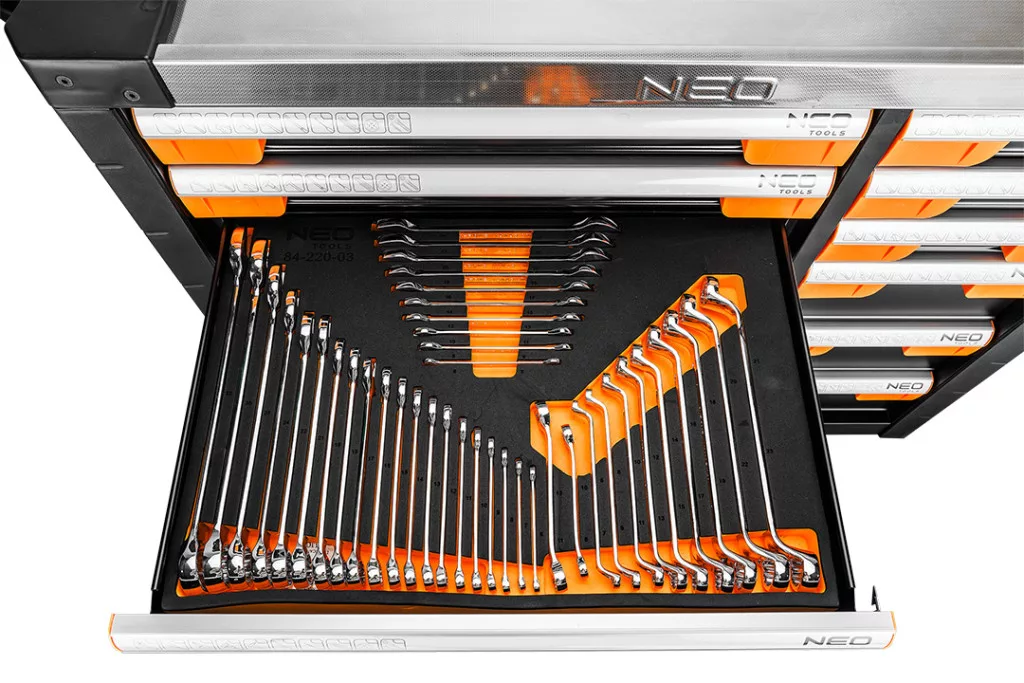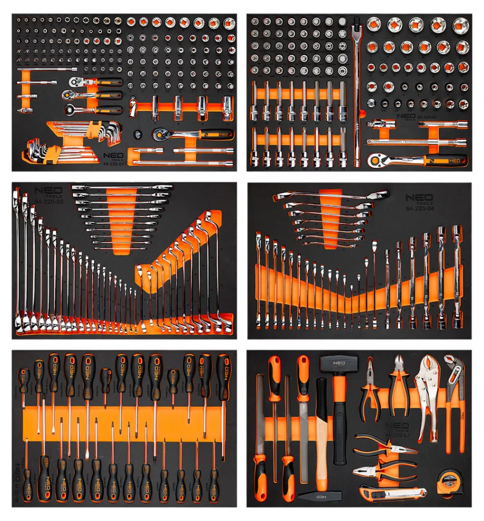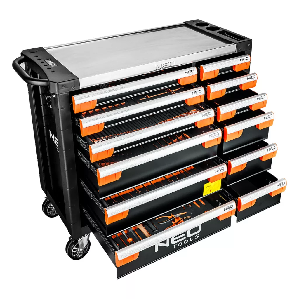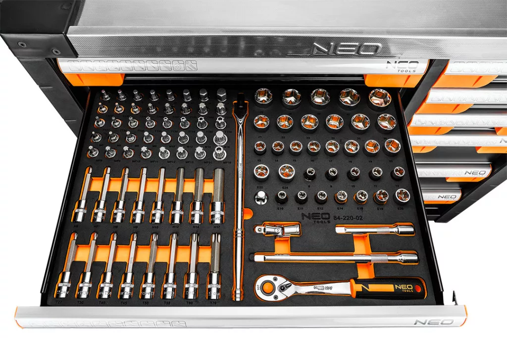 A PRO 12 fiókos szerszámos szekrény tartozékokkal, 358 szerszám 84-225-6 a NEO TOOLS-tól egy professzionális szerszámos szekrény, amelynek maximális terhelhetősége 600 kg. A NEO TOOLS márka 358 szerszámmal kínálja, 12 fiókkal, amelyekhez 12 fiókot terveztek (magas és alacsony, két méretben - nagy és kicsi). Az EVA habszivaccsal bélelt fiókok 6 betétet tartalmaznak tartozékokkal, többek között: ¼" és 3/8" hatszögletű dugókulcsok, TORX dugókulcsok, ötszögletű, HEX és TORX bitek, illesztők, adapterek, hosszabbítók, racsnisok, kulcsok, gyertyás dugókulcsok, dugókulcsok, csavarhúzók, reszelők, kalapácsok vagy fogók.