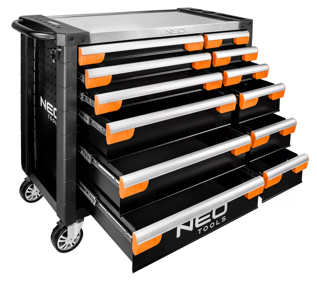 A NEO TOOLS szerszámos szekrény méretei 1105 x 465 x 97 mm, magassága kerekek nélkül 825 mm. Zárható szekrénnyel, oldalsó perforációval rendelkezik a NEO TOOLS kampók számára, alumínium teteje helyet biztosít a csavarhúzóknak és tartozékoknak, valamint tájékoztató matricákkal a fiókok frontjain. A fiókok zárszerkezettel vannak ellátva, és 100%-os nyitást tesznek lehetővé. A szekrény robusztus SPCC acélszerkezetű. Minden szakember számára alkalmas lesz. A PRO Moto Expert sorozat a legigényesebb felhasználóknak is megfelel.