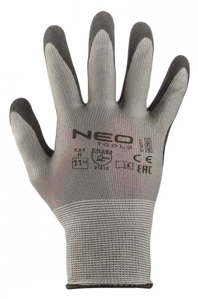 Munkakesztyű, latexbevonatú poliészter (hab), 3141X, 11-es méret, 97-617-11 A NEO TOOLS tökéletes védelmet nyújt kezének a kertészkedés, barkácsolás vagy javítási munkák során. Megvédik kezét a szennyeződésektől, karcolásoktól és kisebb sérülésektől. Tartós poliészterből készülnek, kiegészítő latex bevonattal (krincle). A kesztyűket magas ellenálló képesség jellemzi: kopás, éles szerszámokkal történő vágások, szúrások és szakadások. Jól alkalmazkodnak a kéz formájához, minőségüket a CE tanúsítás és az EN 388 szabvány is megerősíti.