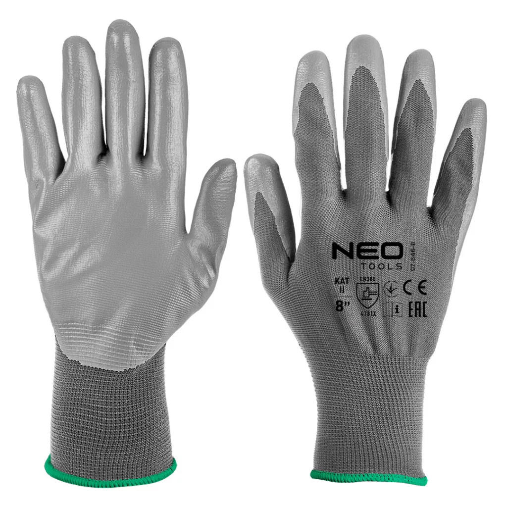 A 97-646-8 munkakesztyű a NEO TOOLS-tól egy erős és tartós poliészter bevonatú poliuretán (sima) kesztyű, amely a legkülönbözőbb alkalmazásokban - szállítási munkák, kertészkedés, építőipar, költöztetés és raktározás, összeszerelési munkák, kis alkatrészek gyártása és barkácsolás - jól használható. A NEO TOOLS munkakesztyűk II. kategóriában készülnek, 4131X. EN388 és EN420 szabvány szerint tanúsítottak, garantálva a 4. kopásállósági osztályt (0-4), az éles tárgyakkal való vágásállóság 1 (0-5), a szakadásállóság 3 (0-4), a szúrásállóság 1 (0-4) és az EN ISO 13997 X szabvány szerinti vágásállóságot. Tökéletesen illeszkednek a kézbe, és 7 és 11" közötti széles méretválasztékban kaphatók.