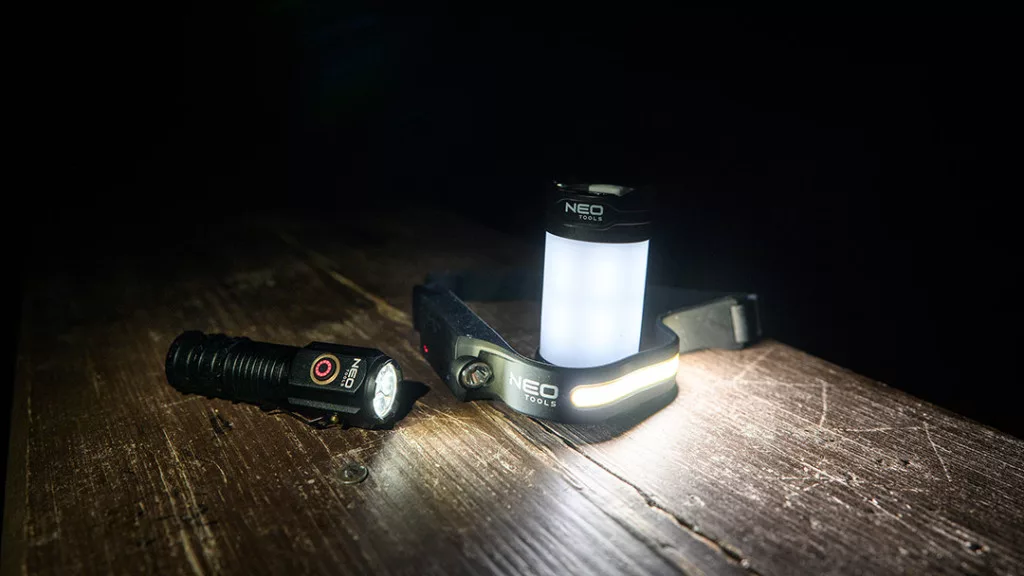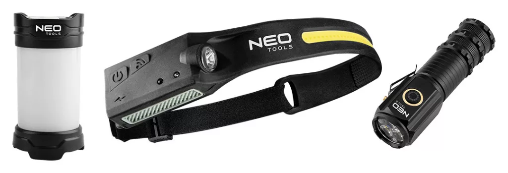 NEO Tools 99-132 Kempinglámpa készlet 3db-os, kézi-sátor-fejlámpa, 150/280/1000 lm, 1200mAh akku, USB-C töltővezeték