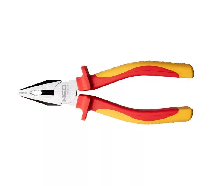 NEO kombinált fogó 1000V . Max. 1000 V feszültség alatti használatra minősített. A kiváló minőségű, indukciósan edzett (55-60 HRC) acél pofák biztosítják a munkadarab biztos fogását, kemény huzalok hatékony vágását és alakítását. Az ergonómikus bimateriál markolat növeli a használat komfortját. A szerszám minőségét bizonyítja a TÜV tanúsítvány és a gyártó által nyújtott 25 éves jótállás. A NEO márka a professzionális igényeket is kielégíti.