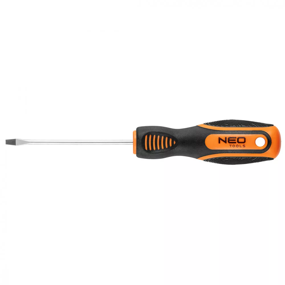 A NEO lapos csavarhúzó kiválóan alkalmas szerelési, barkácsolási munkákra. Hegye nagy ellenállóképességű, a szerszámnak hosszú élettartamot biztosító króm-vanádium acélból készült. A mágneses hegy megkönnyíti a szerszámmal végzett munkát Az ergonómikus, csúszásmentes anyaggal bevont műanyag markolat biztosítja a kényelmet és a biztonságot a munkavégzés során. A NEO márka a professzionális igényeket is kielégíti.