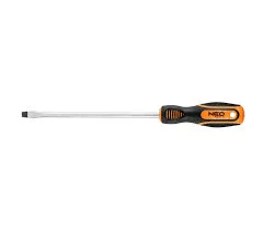 A NEO lapos csavarhúzó kiválóan alkalmas szerelési, barkácsolási munkákra. Hegye nagy ellenállóképességű, a szerszámnak hosszú élettartamot biztosító króm-vanádium acélból készült. A mágneses hegy megkönnyíti a szerszámmal végzett munkát Az ergonómikus, csúszásmentes anyaggal bevont műanyag markolat biztosítja a kényelmet és a biztonságot a munkavégzés során. A NEO márka a professzionális igényeket is kielégíti.