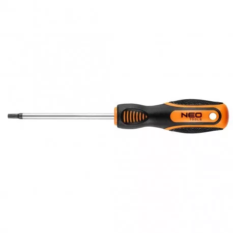 A NEO Torx csavarhúzó kiválóan alkalmas szerelési, barkácsolási munkákra. Hegye nagy ellenállóképességű, a szerszámnak hosszú élettartamot biztosító króm-vanádium acélból készült. A mágneses hegy megkönnyíti a szerszámmal végzett munkát Az ergonómikus, csúszásmentes anyaggal bevont műanyag markolat biztosítja a kényelmet és a biztonságot a munkavégzés során. A NEO márka a professzionális igényeket is kielégíti.