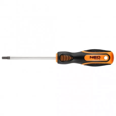 A NEO Torx csavarhúzó kiválóan alkalmas szerelési, barkácsolási munkákra. Hegye nagy ellenállóképességű, a szerszámnak hosszú élettartamot biztosító króm-vanádium acélból készült. A mágneses hegy megkönnyíti a szerszámmal végzett munkát Az ergonómikus, csúszásmentes anyaggal bevont műanyag markolat biztosítja a kényelmet és a biztonságot a munkavégzés során. A NEO márka a professzionális igényeket is kielégíti.