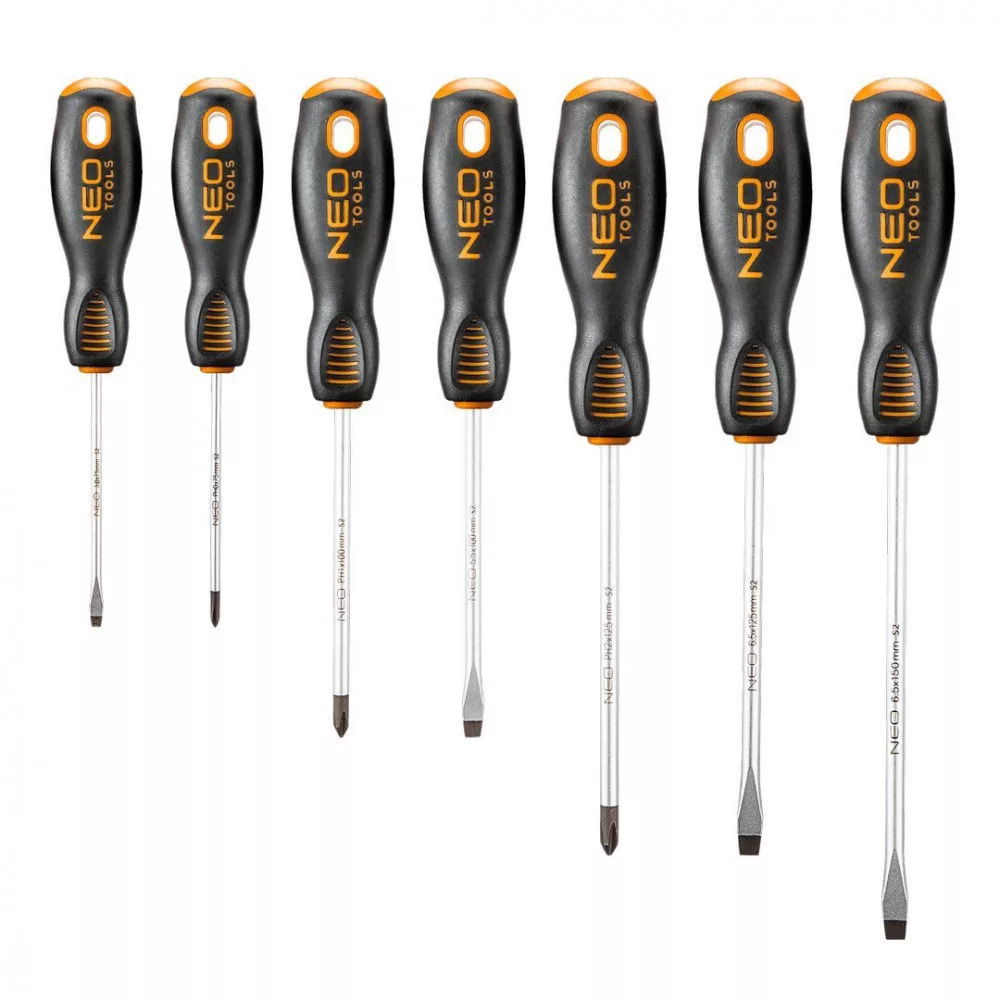 Csavarhúzó készlet, 7 db-os, S2 acél, mágneses csavarhúzó hegy, háromszög keresztmetszetű markolat, formatervezett hüvelyktámasz, vegyszer-, ásványolaj- és kenőanyagálló TPR műanyaggal borított markolat, méretek: lapos: 6 x 150 mm, 6 x 125 mm, 5 x 100 mm, 3 x 75 mm, kereszt: PH2x125 mm, PH1x100 mm, PH0x75 mm
