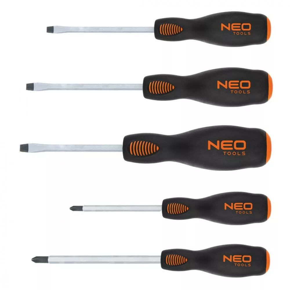 Üthető csavarhúzó készlet, 5 db-os, kereszt: PH1x0,75, PH2x100, lapos: 5,5x100 mm, 6,5x125 mm, 8x150 mm,S2 acél, a csavarhúzó hegy keménysége 56 HRC, mágneses csavarhúzó hegy, háromszög keresztmetszetű markolat, hüvelyktámasz, vegyszer, ásványi olaj és kenőanyagálló, TPR műanyaggal borított markolat, TÜV tanúsítvány