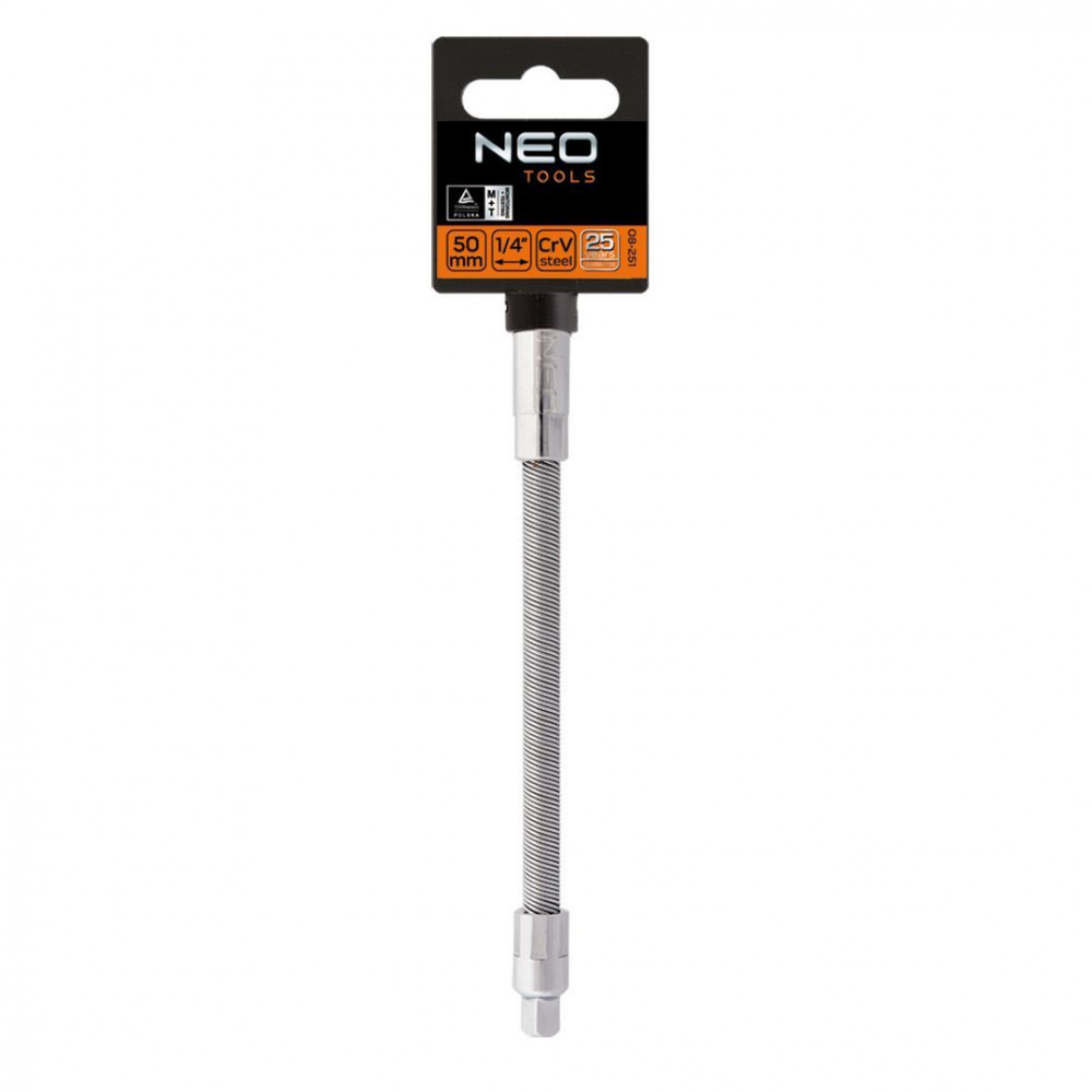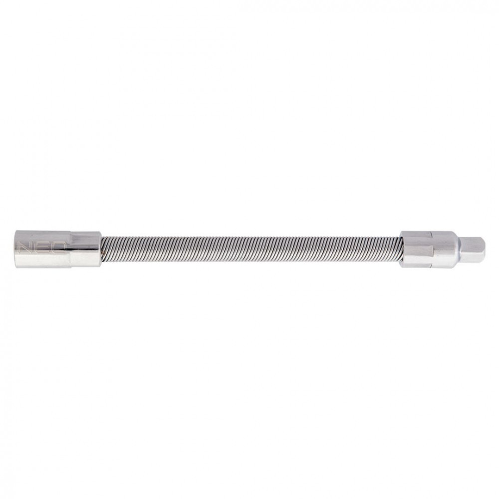 NEO 140 mm-es, ¼”-os flexibilis hosszabbító. Nagy ellenállóképességű króm-vanádium acélból készül. Lehetővé teszi a munkát nehezen hozzáférhető helyeken. A termék kiváló minőségét és megbízhatóságát bizonyítja a TÜV Rheinland tanúsítvány. A NEO márka a professzionális igényeket is kielégíti.