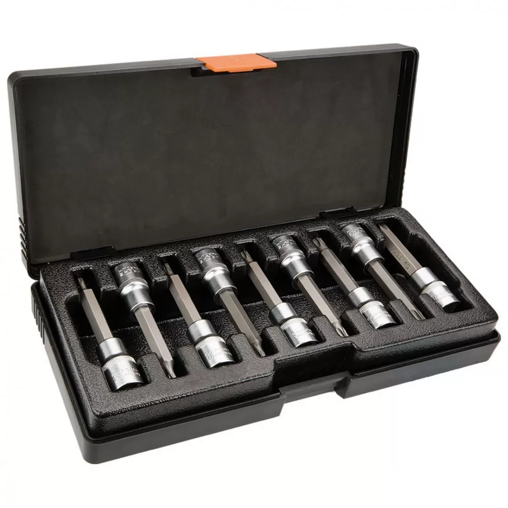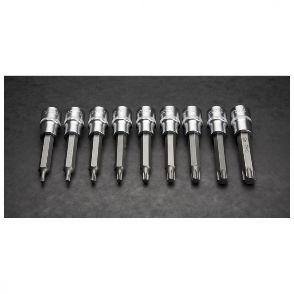 Torx dugó bit 9 db-os klt. 100 mm, ½, dugókulcs CrV acél, bit S2 acél, méretek: T20, T25, T27, T30, T40, T45, T50, T55, T60
