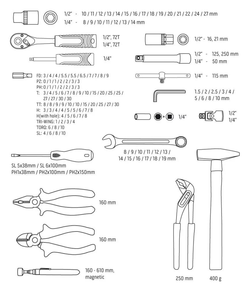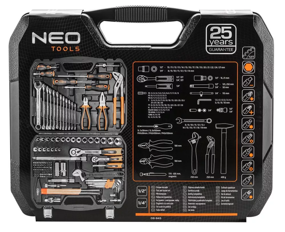 A NEO szerszámkészlet (ref. 08-945) nagyon jó megoldás mechanikai, elektromos, vízvezeték-szerelési, háztartási munkákhoz. A 143 tétel éppen megfelel az otthoni műhely igényeinek. A 2 méretű racsni és a tartozékok széles körű felhasználási lehetőséget biztosítanak: az 1/2" méret lehetővé teszi a nagy erők alkalmazását, az 1/4" méret pedig lehetővé teszi, hogy ott is használhassa, ahol semmi más nem fér el. Minden mérethez 72 fogú precíziós racsni (5o osztás), egy készlet hatszögletű foglalat, hosszabbítók és csuklók - az alapok. Fordítson különös figyelmet a készlet tartalmára: gyújtógyertya dugókulcsok - a szerelőnek, csavarhúzók, fogók - a villanyszerelőnek, barkácsolónak, kalapács, csőkulcs, állítható csőkulcs - szerszámok minden alkalomra, az 1/4" csavarhúzó nyele közönségesnek tűnik, de a nyélben egy extra 1/4" foglalat található, amely lehetővé teszi, hogy hosszabbítóként használhassa egy extra nyéllel a pontos vezetéshez. Ha ehhez hozzáad egy adapteres bitkészletet és egy sor 1/4"-os aljzatot is adunk - gyakorlatilag bármit össze lehet csavarozni. Tökéletes kiegészítői a gyűrűs csavarkulcsok, amelyek a csavarok lazításán és meghúzásán kívül tökéletesen működnek támasztékként is, amikor a racsnival dolgozva egy csavart vagy anyát tartanak a csatlakozás másik oldalán. Az elemek száma több ezer kombinációt tesz lehetővé, és gyakorlatilag csak a képzelet szab határt a lehetőségeknek. Minden dugókulcs, racsni és csavarkulcs nagy szilárdságú króm-vanádium acélból (Cr-V), a csavarhúzóhegyek S2 szerszámacélból készülnek. Az egész egy méretre szabott, masszív tokban, fémkapcsokkal.