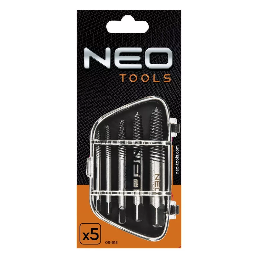 NEO törtcsavarkiszedő készlet. Kiváló minőségű, a terméknek hosszú élettartamot biztosító króm-molibdén acélból készült. A készletben 5 db kiszedő van, tipikus méretekben: M3-6 mm, M6-8 mm, M8-11 mm, M11-14 mm és M14-18 mm. A készlet praktikus, átlátszó fedeles tetejű tokba csomagolt. A szerszám minőségét bizonyítja a TÜV tanúsítvány és a gyártó által nyújtott 25 éves jótállás. A NEO márka a professzionális igényeket is kielégíti.