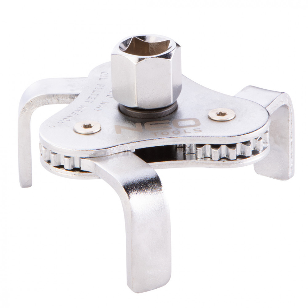 NEO olajszűrőkulcs profi szervizek és autószervizek számára, valamint haladó amatőrök számára. Fémházas külső olajszűrők hatékony és helyes beszereléséhez tervezett kulcs. A kulcs lapos pofákkal rendelkezik. Háromkaros szerkezet. 64 és 100 m közötti átmérőjű szűrőkhöz alkalmas. A készlet 3/8" és 1/2" redukciót tartalmaz.