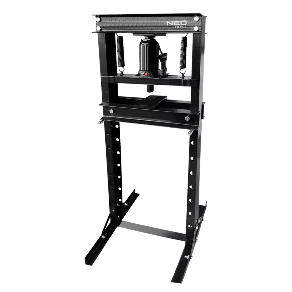 Hidraulikus prés, 20t nyomóerő, befogási magasság 0-905 mm, 11-714, NEO TOOLS - kiegyenesítésre, hajlításra, bepréselésre stb. szánt eszköz. Az acélból készült szerkezet keresztirányú munkalapja 6 különböző szinten rögzíthető. Ezenkívül a készlet részét képezi több öntöttvas lap kivágásokkal.