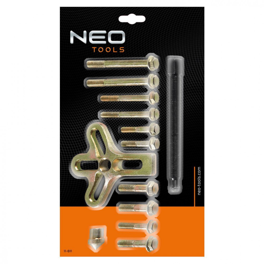 A NEO kerékagy lehúzó készlet 13 db, kiváló minőségű, hosszú élettartamot és hibamentes működést biztosító acélból készült elemet tartalmaz. A készletben megtalálhatók a megfelelő hosszúságú segédcsavarok is: 95 mm-es, 75 mm-es és 45 mm-es. A fő kinyomócsavar 130 mm-es. A NEO márka a professzionális igényeket is kielégíti.