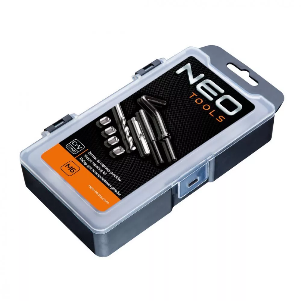 NEO menetjavító készlet kiváló minőségű króm-vanádium acélból készült szerszámokkal és menetjavító betétekkel az M6-os menetek javításához. Ebben fúrószár, menetfúró és 4db menetjavító betét. Minden műhelyben hasznos. A NEO márka a professzionális igényeket is kielégíti.