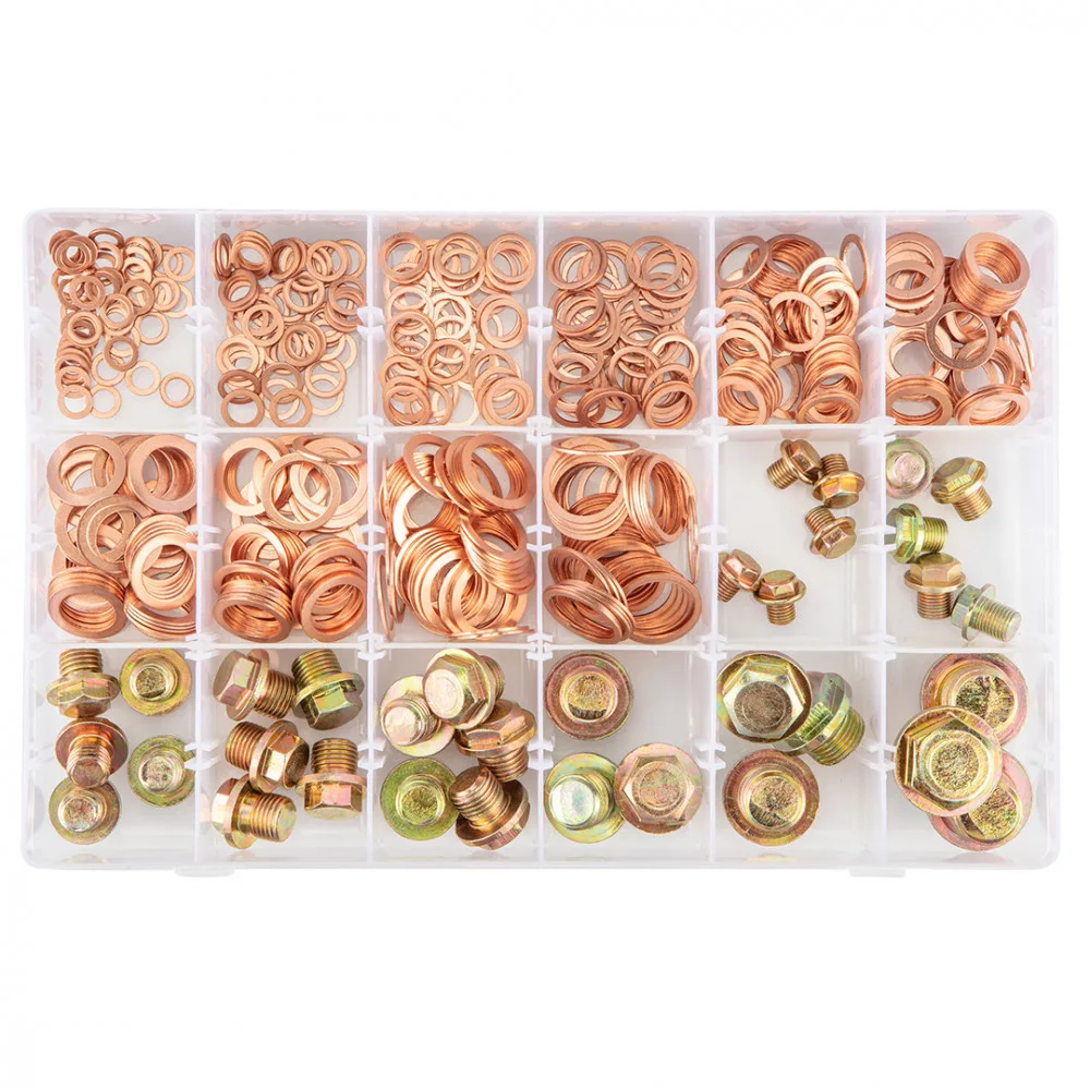 Rézalátét készlet: 5 x (M8x1), 5 x (M10x1), 5 x (M12x1.5), 5 x (G1/4), 5 x (M14x1.5), 3 x (M16x1.5), 3 x (M18x1.5), 3 x (M20x1.5)