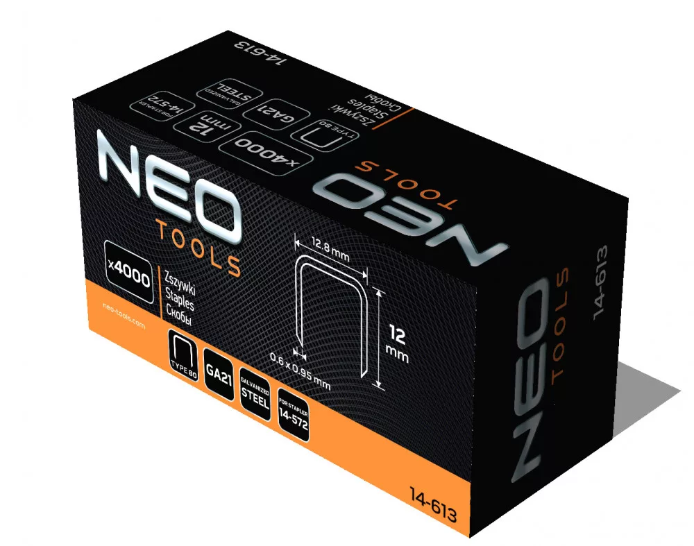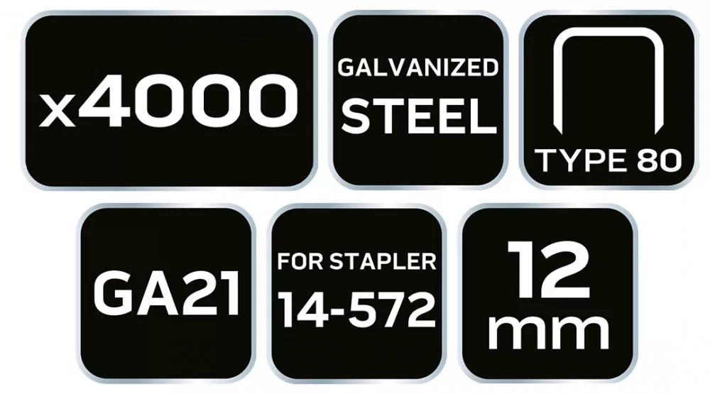 Galvanizált kapcsok pneumatikus tűzőgéphez (14-572), GA21, 80-as típus (380), hossza 12 mm, 4000 darab 14-613 NEO acélhuzalból készült, galvanizált, korrózióálló kapcsok. A 14-572 NEO pneumatikus tűzőgéphez készültek. Jellemzőjük a 12 mm hosszúság, 80-as (380-as) típus, GA21. 4000 darabos készletben kínálják őket. Mindenféle pneumatikus tűzőgéppel végzett munkához ajánlott tűzőkapocs. Alkalmasak lesznek professzionális alkalmazásokhoz.