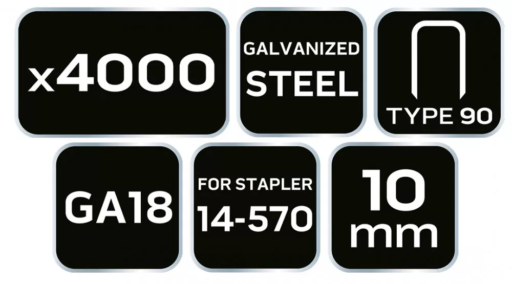 A NEO 14-620 horganyzott kapcsok pneumatikus tűzőgéphez (14-570), GA18, 90-es típus (4K), hossza 10 mm, 4000 darab 14-620 a NEO acélhuzalból készült, horganyzott, korrózióálló kapcsok. A NEO 14-570 pneumatikus tűzőgéphez készültek. Jellemzőjük a 10 mm hosszú, 90-es (4K) típusú, GA18. 4000 darabos készletben kínálják őket. Mindenféle pneumatikus tűzőgéppel végzett munkához ajánlott tűzőkapocs. Alkalmasak lesznek professzionális alkalmazásokhoz.
