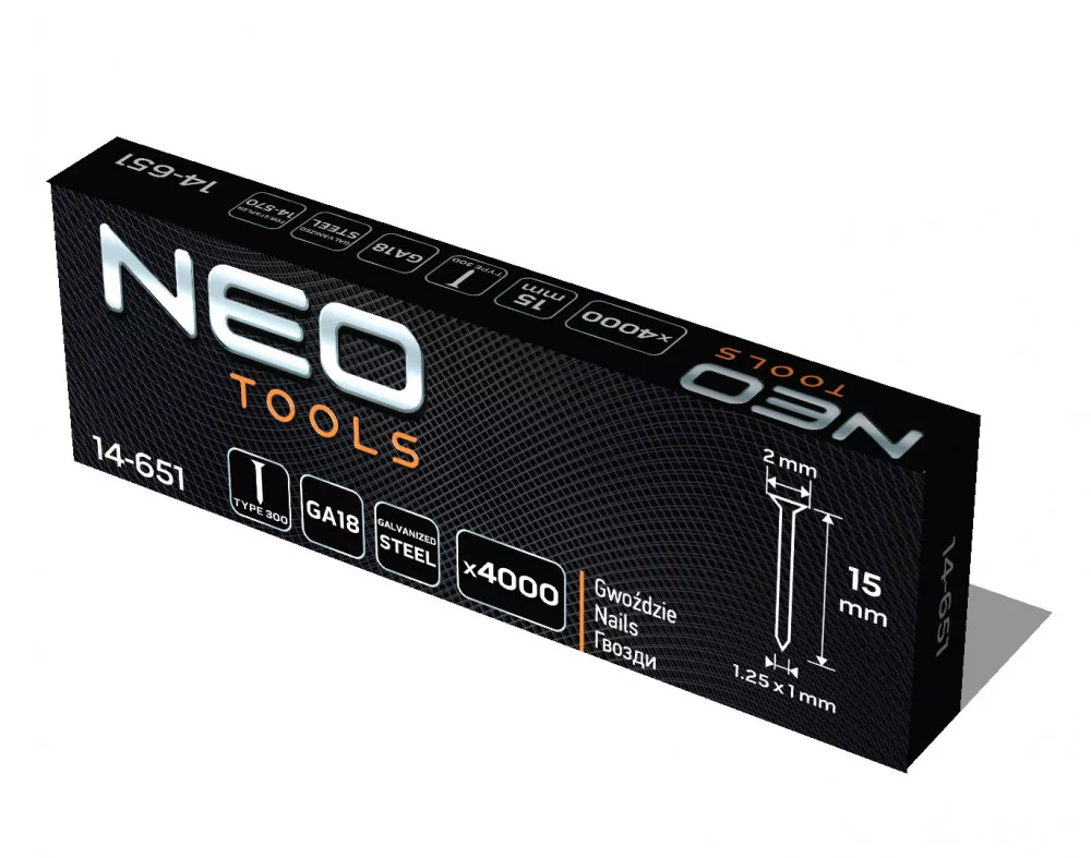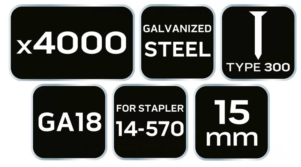 Galvanizált szögek pneumatikus tűzőgéphez (14-570), GA18, 300 (F) típus, 15 mm hosszú, 4000 darab 14-651 a NEO-tól, acélszögek, galvanizáltak, ezért korrózióállóak. A NEO 14-570 pneumatikus tűzőgéphez készültek. Jellemzőjük a 15 mm hosszú, 300 (F) típusú, GA18. 4000 darabos készletben kínálják őket. Mindenféle pneumatikus tűzőgéppel végzett munkához ajánlott szögek. Alkalmasak lesznek professzionális alkalmazásokhoz.