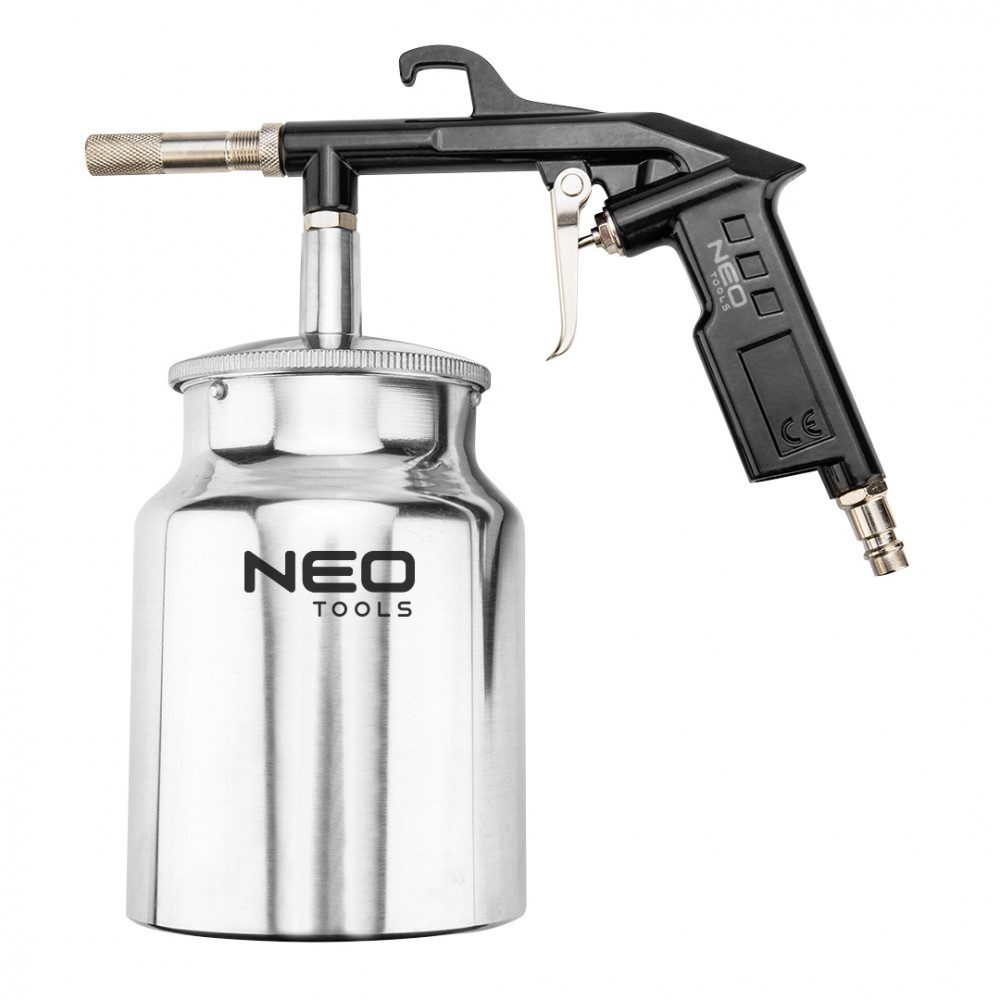 NEO homokfúvó pisztoly 1 literes tartállyal. Praktikus füllel a felakasztáshoz. Maximális üzemi nyomása 6 bar. A CE tanúsítvány bizonyítja a szerszám kiváló minőségét. A NEO márka a professzionális igényeket is kielégíti.