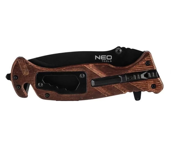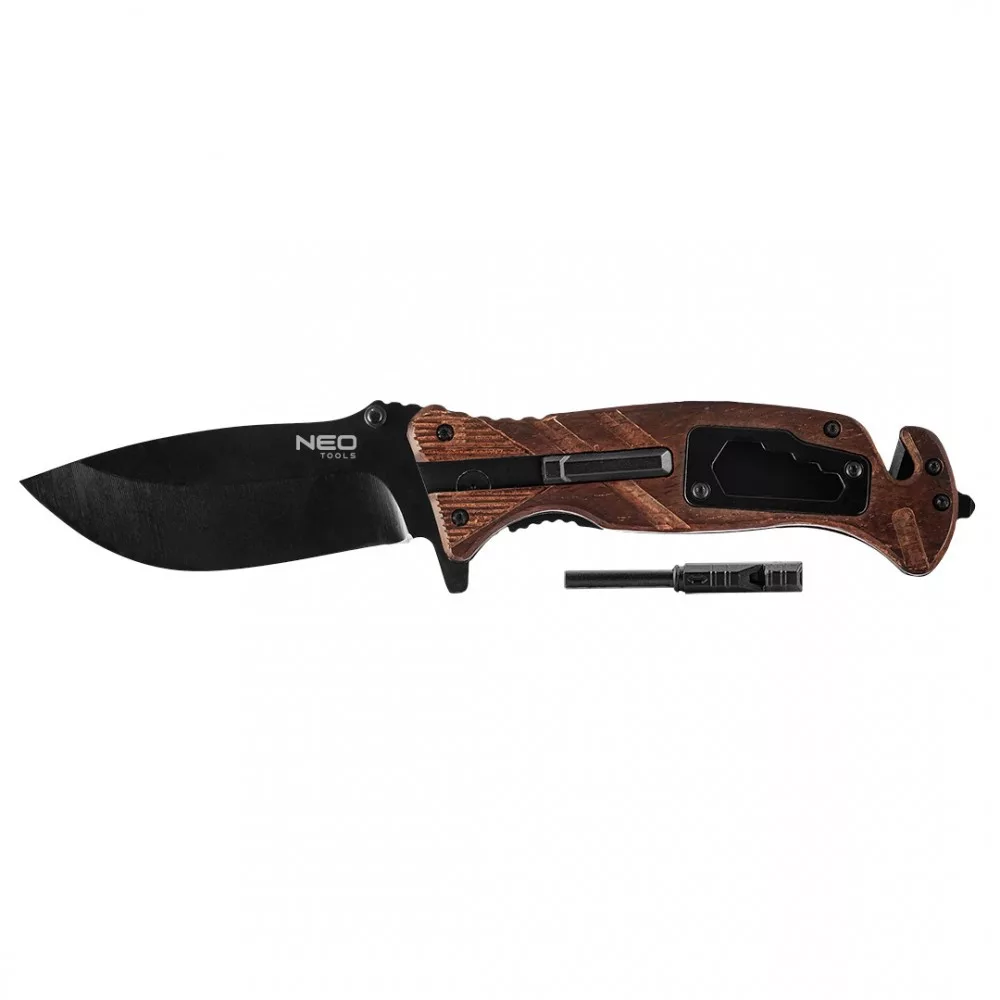 A NEO összecsukható túlélőkés (ref. 63-107) 22 cm teljes hosszal és 9 cm pengével egy multifunkcionális 6 az 1-ben eszköz, amely a következőket tartalmazza: kés, tűzszerszám, síp, csavarkulcs, övpenge és üvegtörő. Kiváló minőségű rozsdamentes acélból készült, amely ellenáll a mechanikai sérüléseknek. A fogantyú tartós műanyagból készült a biztos fogás érdekében. A kés övcsipesszel rendelkezik, amely lehetővé teszi, hogy az eszköz mindig kéznél legyen.