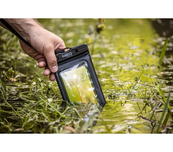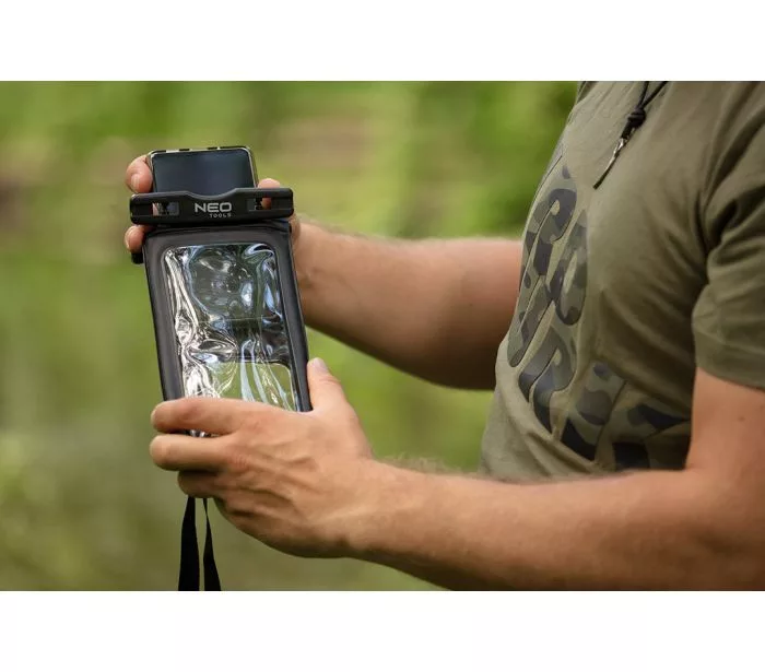 A NEO vízálló telefontok (ref. 63-135) PVC és ABS anyagokból készült. Védelmet nyújt a vízzel szemben, IPX8 fokozatú. A tokot olyan készülékhez tervezték, amelynek maximális átmérője 6,2". A termék méretei: 19,5 x 11 cm