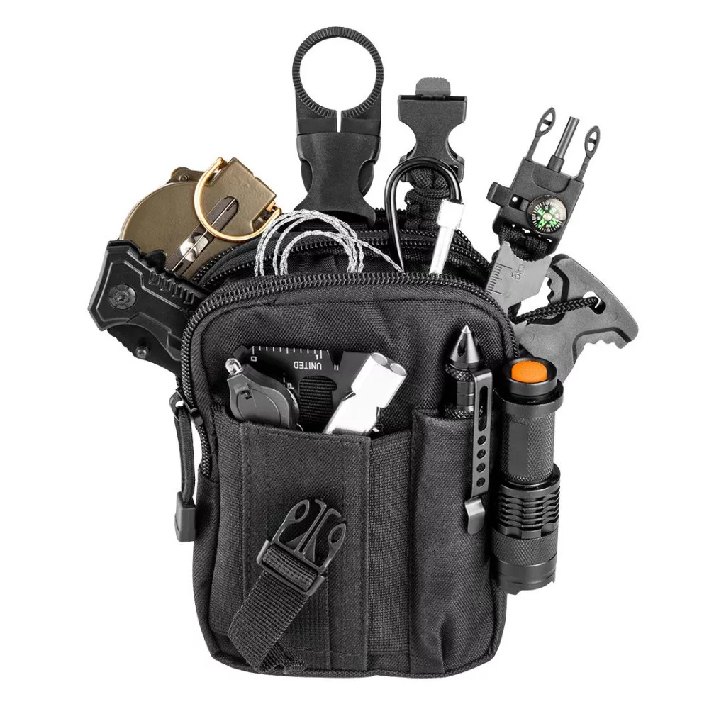 A NEO 63-153-as 14 az 1-ben túlélőkészlet tokban egy készlet, amely egy palacknyitóval ellátott tűzkőből, egy összecsukható pengéjű késből, egy zseblámpából, egy túlélő karkötőből (paracord kötéllel, tűzkővel és iránytűvel), egy sípból, egy rozsdamentes acélból készült többfunkciós kártyából (palacknyitóval, konzervnyitó, fűrész, 4,5,6,7 mm-es gyűrűskulcs, mérőszalag, lapos csavarhúzó, kés, paracord kötél), drótfűrész, taktikai toll, üvegcsipesz, összecsukható iránytű, 2 db karabiner, mini zseblámpa kulcskarikával, táska övcsatokkal. Hasznos vágáshoz, világításhoz vagy területek megvilágításához, tűzgyújtáshoz, vészhelyzetben ablakok betöréséhez, vizes palack tárolásához, útbaigazítás ellenőrzéséhez. Ajánlott a túlélés szerelmeseinek, útra és kempingezéshez.
