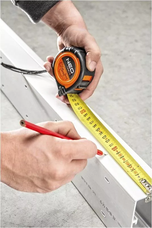 NEO acél mérőszalag, dupla szalagreteszeléssel. A mérőszalag poliamid bevonata védi a rányomtatott skálát a kopástól. A mágneses vég és a szalag profilja megkönnyíti a mérés kivitelezését. A tekercselési ütközéscsillapító védi a végzáró kampót a letöréstől. A szalagvég két szegeccsel megerősített. A ház ergonómikus formakialakítása biztos és kényelmes fogást nyújt, a csúszásmentes kivitel biztosítja a használati komfortot és biztonságot. Megbízhatóságának garanciája a MID európai uniós mérőeszköz irányelv követelményeinek megfelelő kivitel. A NEO márka a professzionális igényeket is kielégíti.
