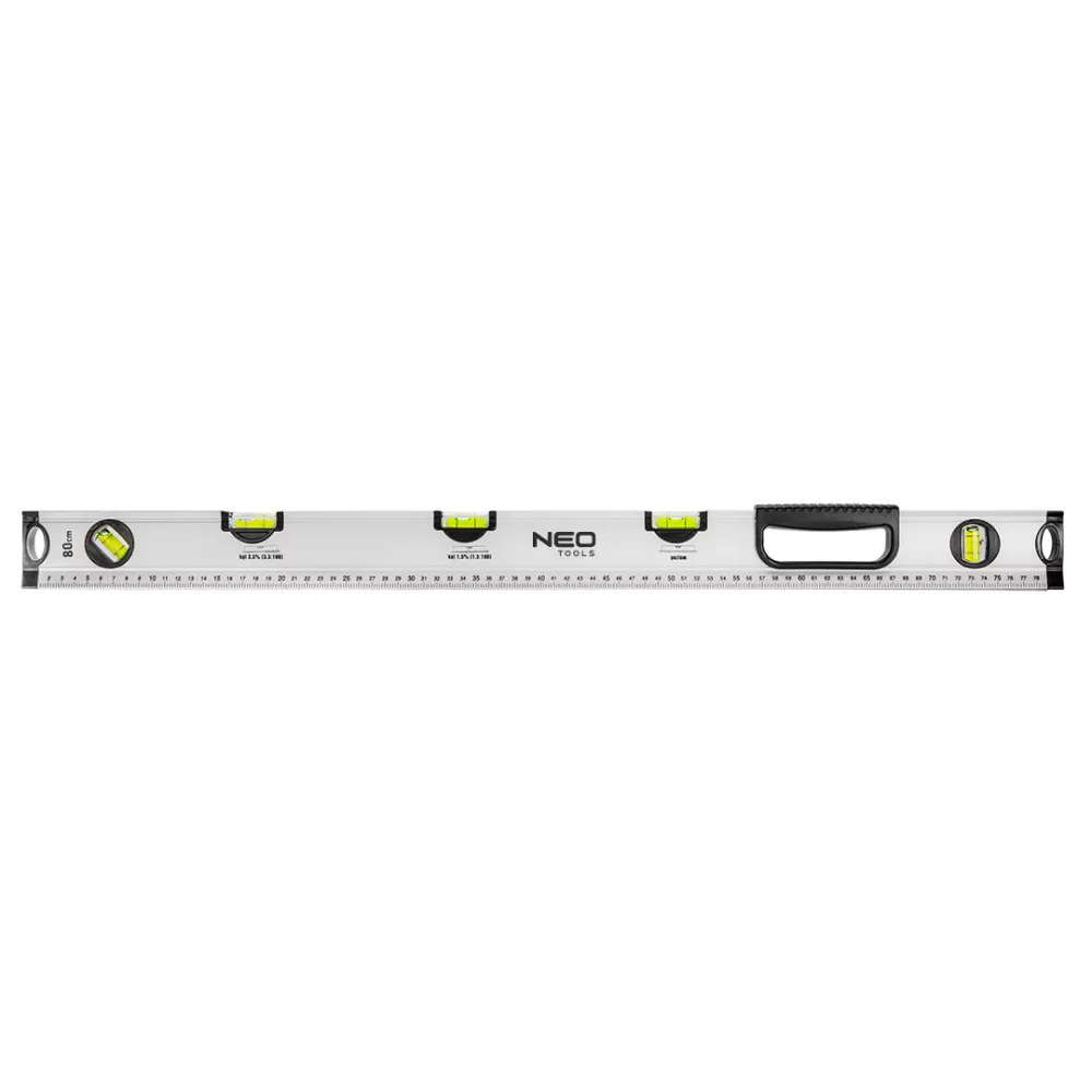 Speciális vízmérték 80 cm, 5 fiolával, különböző szögek 71-123 a NEO márkától egy profiknak szánt eszköz, akár 5 fiolával. Lehetővé teszi a következő szögek mérését: 0°, 1,5°, 3,5°, 45°, 90°. A vízmérték 80 cm hosszú, 3 cm széles. A pontossága ±0,5 mm/m. A kényelmes fogantyú és a szerszám mindkét oldalán található metrikus skála megkönnyíti a munkát. Többek között csatornavezetékek vagy járdakövek lejtésének mérésére ajánlott.