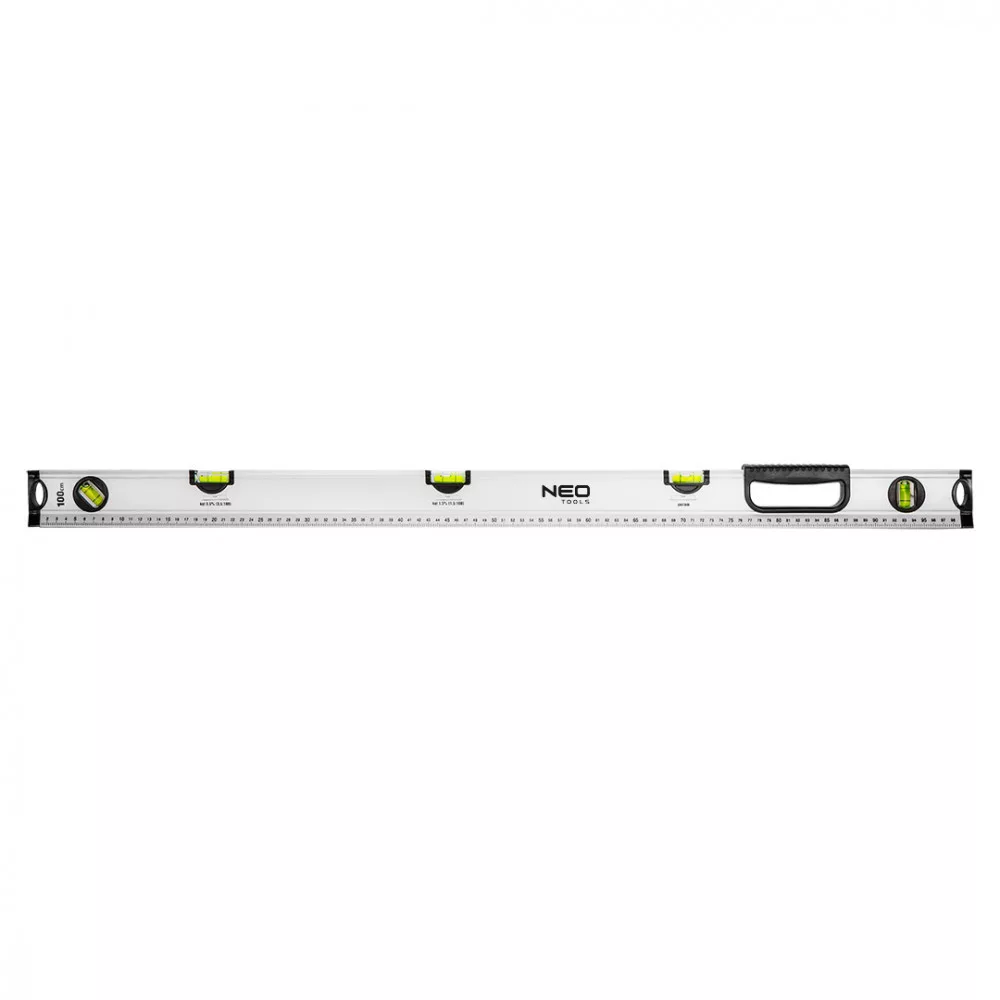 Speciális vízmérték 100 cm, 5 fiola, különböző szögek 71-124 a NEO márkától a szakemberek számára, akár 5 fiolával. Lehetővé teszi a következő szögek mérését: 0°, 1,5°, 3,5°, 45°, 90°. A vízmérték 100 cm hosszú, 3 cm széles és 6 cm magas. A pontossága ±0,5 mm/m. A kényelmes fogantyú és a szerszám két oldalán található metrikus skála megkönnyíti a munkát. Ajánlott többek között a csatornavezetékek vagy járdakövek meredekségének mérésére.