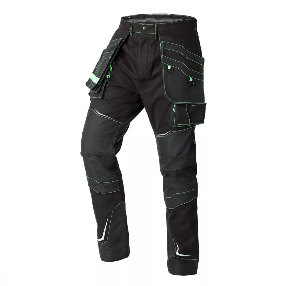 A Premium PRO munkanadrág, S méret, 81-234-S a NEO-tól 100% Canvas pamutból készült, 425 g/m2 súlyú főszövetből készült, és Cordura NYCO 75% pamut, 25% nylon, 272 g/m2 súlyú Cordura NYCO anyaggal erősítették meg a zsebeken, a térdeken, a háton és a lábszárak alján. A nadrág fekete színű, a varráson kontrasztos neonzöld színnel. YKK cipzárral és 3M fényvisszaverő nyomatokkal ellátva. Háromszoros varrással rendelkeznek. Akár 18 zseb is jellemzi őket: 3 cipzáras, 4 mágneses záródású, levehető zseb 7 rekesszel, valamint szerszámhorgokkal és egy azonosító zsebbel. A profilozott térdek és a NYCO Cordurával megerősített lábszárak, a nadrág meghosszabbításának lehetőségével, hozzájárulnak a kényelemhez. Belül van egy bevarrt, csúszásgátló nyomtatással ellátott gumiöv és egy további cipzár, amely lehetővé teszi, hogy a sorozatból származó pulóverrel kombináljuk őket egy öltönyben. A lábak hátsó részén egy fedett cipzáras szellőző is található. Az azonosító címke viszont megkönnyíti a munkahelyi azonosítást, a meghosszabbított övhurokon lévő logó pedig biztosítja a termék magas minőségét. A NEO márkát szakemberek és barkácsolók számára ajánljuk. A Premium PRO nadrág CE tanúsítvánnyal rendelkezik.
