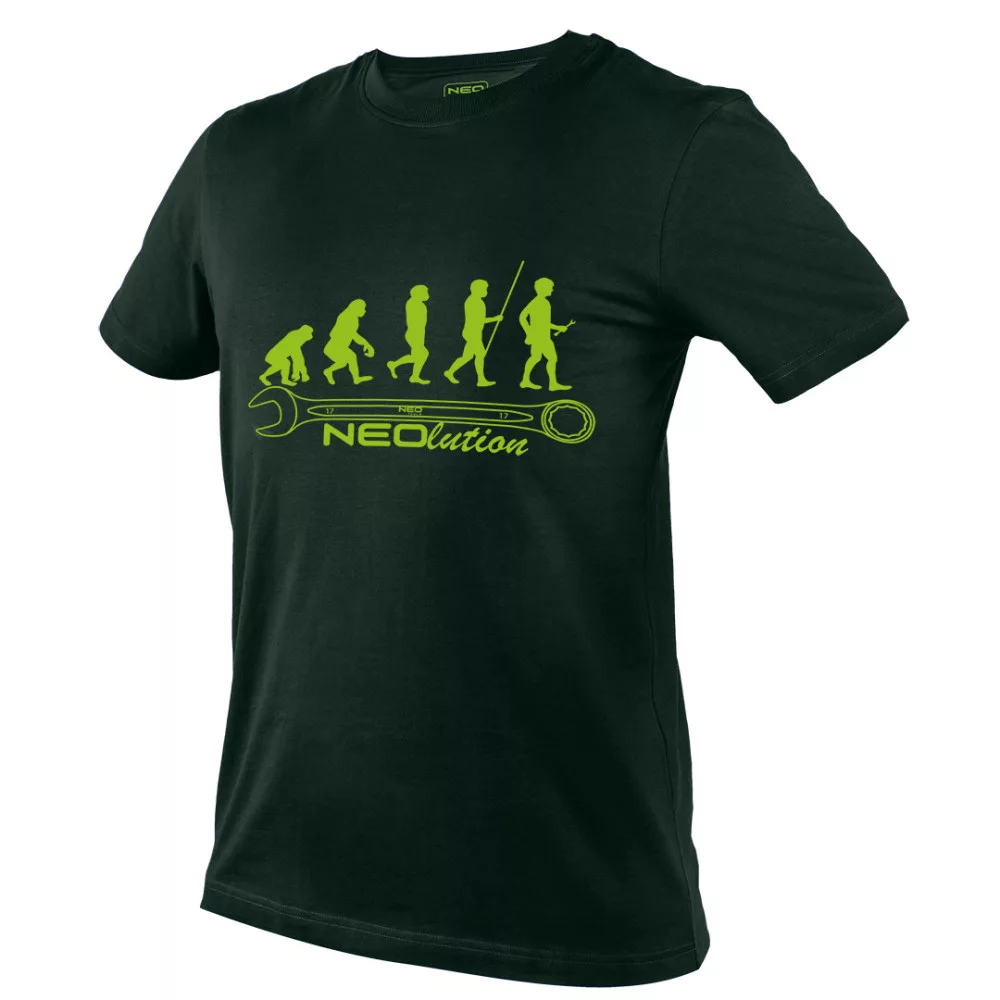 Nyomtatott póló, NEOlution, XXL méret 81-640-XXL a NEO-tól egy NEOlution grafikával ellátott, palackzöld színű munkapóló. Az előlapon lévő neonzöld nyomtatás az evolúció egyszerűsített rajzát ábrázolja - az ember az australopithecustól a NEO szerszámokat (köztük egy villáskulcsot) használó emberig. Rövid ujjú, kerek nyakkivágással és elasztikus szalaggal. Puha 180 g/m2 pamutból (100%) készült. A márka egyedi, házon belüli dizájnja, valamint a nyakra nyomtatott logó és névtábla teszi ezt a pólót szinte minden alkalomra tökéletes pólóvá - munkába és alkalmi sétákhoz egyaránt. A NEO márkájú ruházat CE tanúsítvánnyal rendelkezik.