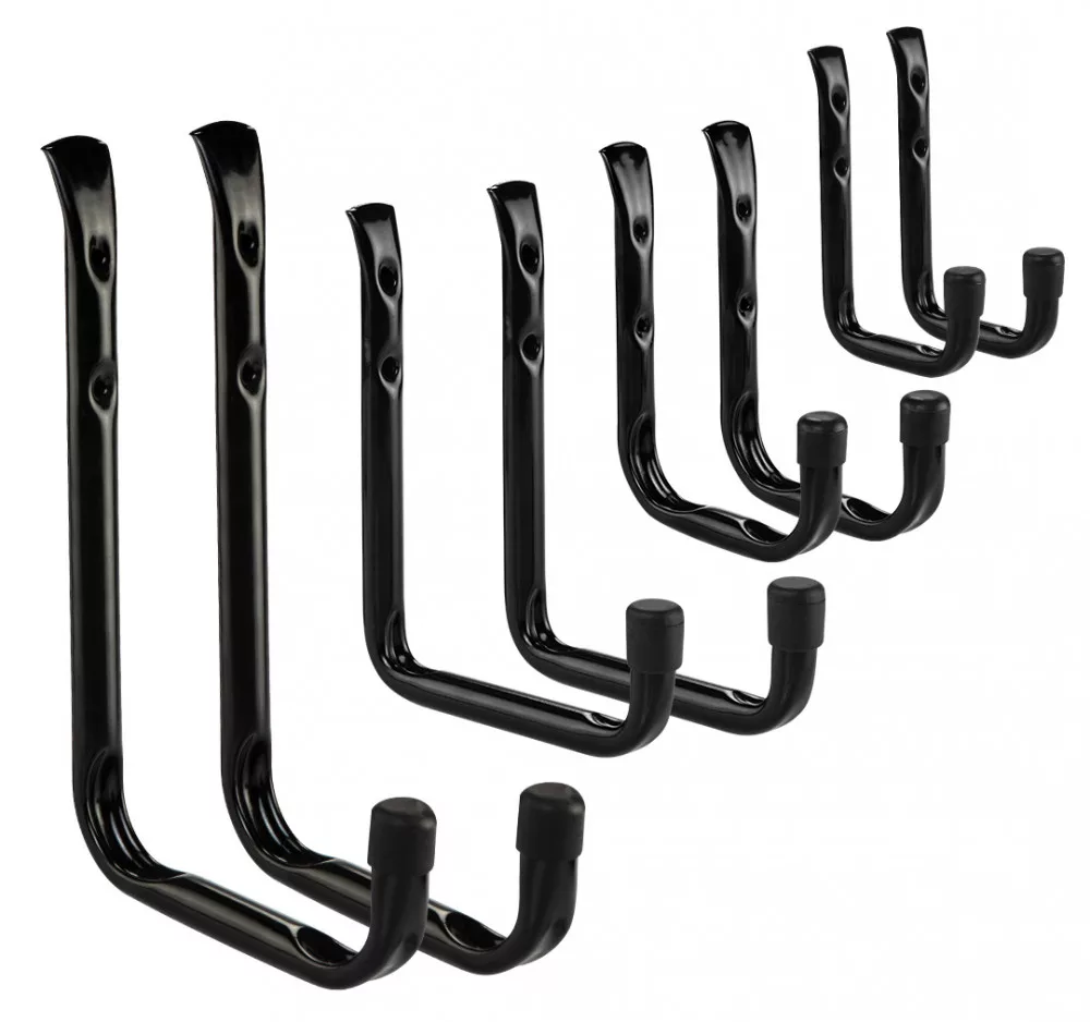 Garázshorgok, 8 db-os készlet. Anyag: alumínium, vastagság 1mm, 2 db méret 123x82x12mm kapacitás 25kg, 2 db méret 145x115x12mm kapacitás 20kg, 2 db 190x150x19mm kapacitás 16kg, 2 db 290x200x19mm kapacitás 16kg, fali csatlakozók mellékelve