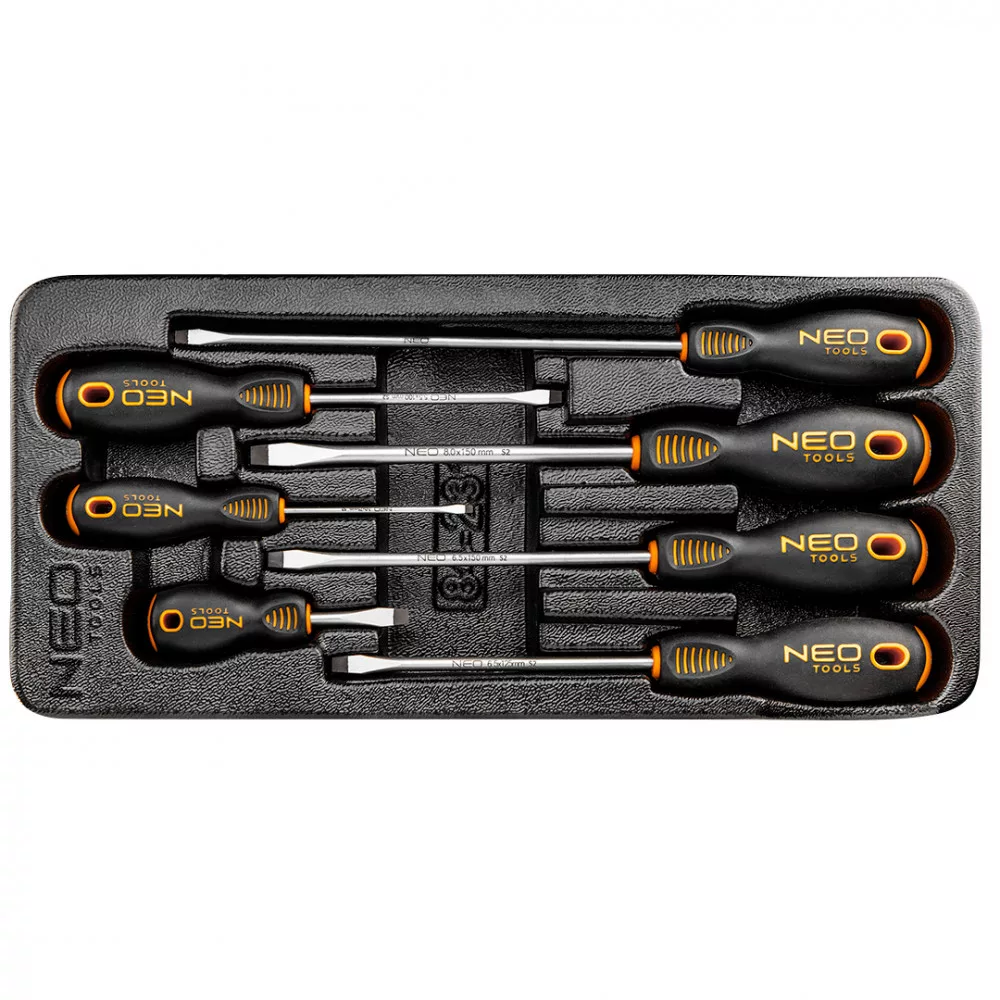 NEO lapos csavarhúzók (ref.sz. 84-231) S2 acél, háromszöges kialakítású markolat, szilárdított és mágneses fej, TPR gumibevonatú, olajnak ellenálló markolat, hüvelykujj támasz, TÜV, méretek: 3.0x75mm, 5.5x100mm, 5.5x200mm, 6.5x38mm, 6.5x125mm, 6.5x150mm, 8x150mm, profilozott betét