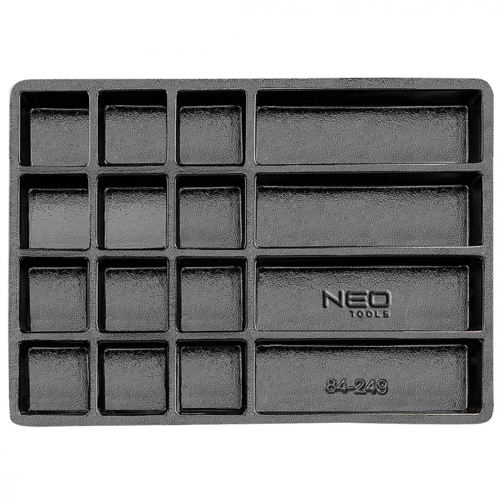 Szekrény betét, (ref.sz. 84-249) profilozott betét a Neo 84-221 és 84-222 szekrényekhez csavarok és egyéb apróságok számára. Kemény és tartós polipropilénből. Minden műhelyben haszna vehető. A szerszám minőségét a TÜV tanúsítvány és a gyártó 25 éves garancia igazolja. A NEO márka a professzionális igényeket is kielégíti.