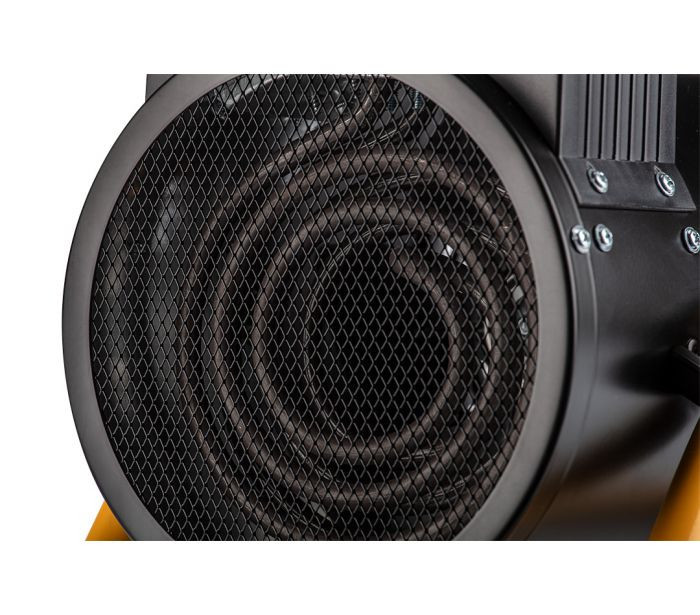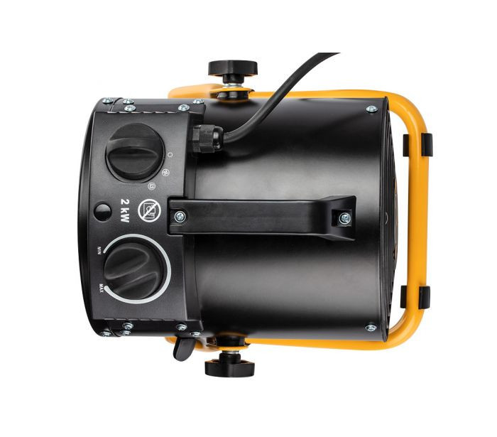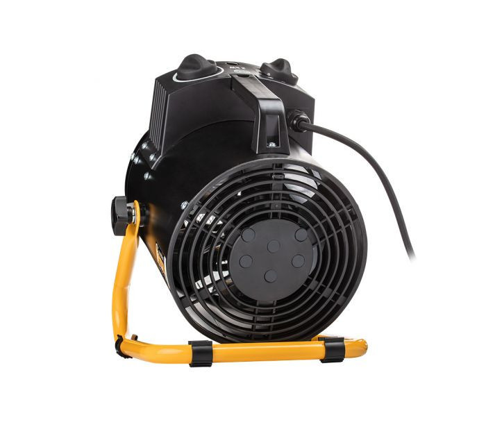 3 kW teljesítményű ipari elektromos fűtőberendezés, fűtőelem rozsdamentes acél, állítható termosztát, túlmelegedés elleni védelem, ventilátorral, állítható szög, szigetelt fogantyú, IPX4 nedves területeken történő használatra, légáram 354 m3/h
