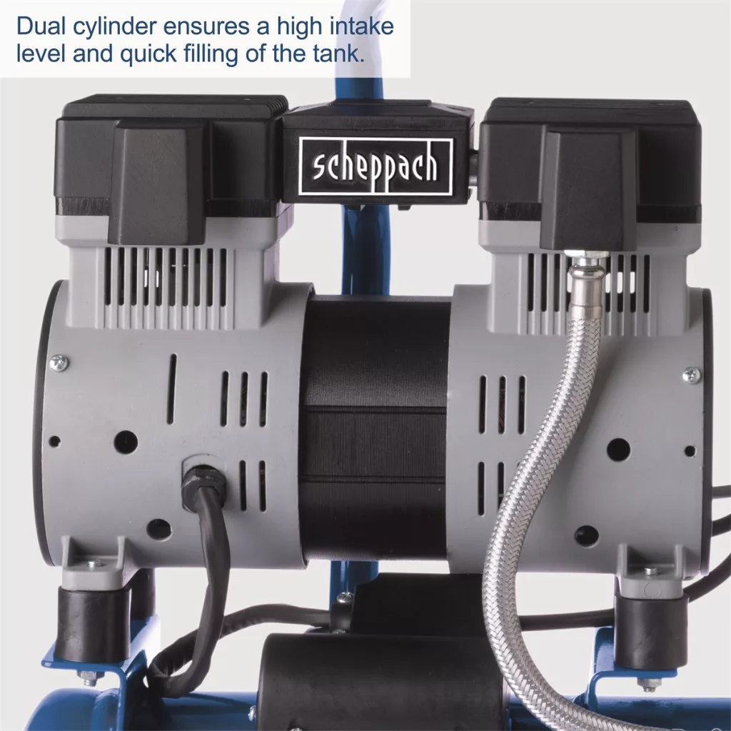 A Scheppach Ultra Silent HC08Si kompresszor univerzálisan alkalmazható ház körüli munkákhoz, műhelyben vagy garázsban. Alacsony zajszintű kompresszorként kivételesen alacsony zajszinttel lenyűgöző – így még a szomszédokat sem fogja zavarni.