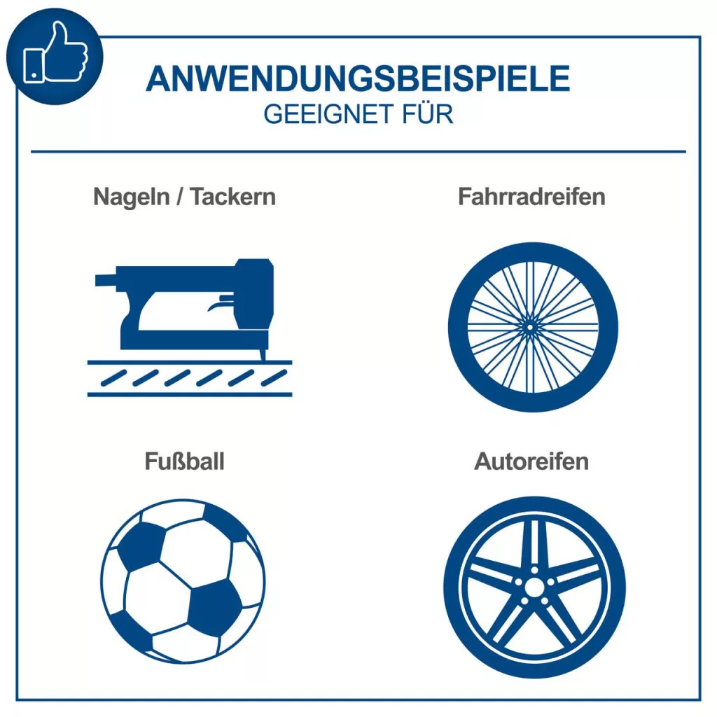 162 l/perc szívóteljesítményével a nagy teljesítményű kompresszor alkalmas kerékpárgumik, labdák vagy autógumik felfújására, valamint pneumatikus szerszámok működtetésére.