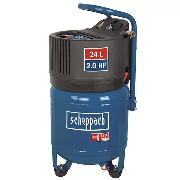 Scheppach HC24V Olajmentes vertikális kompresszor A Scheppach HC24V vertikális kompresszor nagyon helytakarékos gép, amely az olajmentes modern motornak köszönhetően minimális karbantartást igényel. Ideális általános otthoni használatra és a kisebb műhelyekbe vagy garázsokba. A tartály a sűrített levegő tárolására szolgál, így a motor csak abban az esetben kapcsol be, amikor a levegőnyomás lecsökken a kívánt szint alá. A levegőtartálynak köszönhetően, összetettebb munkákat is végezhet a géppel. A kompresszorhoz csatlakoztatni lehet pl. tűzőgépet, szórópisztolyt (airbrush), fúvópisztolyt és egyéb pneumatikus szerszámot is. Az autógumik felfújásánál nagyra értékelhetik a könnyen beállítható nyomásszintet, amit egyszerűen ellenőrizhetnek a beépített manométer segítségével. Az olajmentes technológiának köszönhetően kiválóan alkalmas a söröshordók nyomásának biztosításához is. A kiegészítő markolat, az alacsony súlya, megkönnyítik a gép könnyű kezelhetőségét. További tartozékok: • Manométer üzemi nyomás méréséhez • Szűkítő szelep • Nyomáskapcsoló • Leeresztő szelep • Visszacsapó szelep • Biztonsági szelep, markolat Műszaki adatok: Motor: 230 V / 50 Hz Teljesítmény: 1 500 W / 2,0 LE Fordulatszám: 3 750 fordulat / perc Üzemi nyomás: 10 bar Légtartály térfogata: 24 l Szívóerő: 180 l/perc Üzemi nyomásszabályozás: igen Gép méret: 340 x 305 x 660 mm Súly: 16 kg 2+2 év garancia